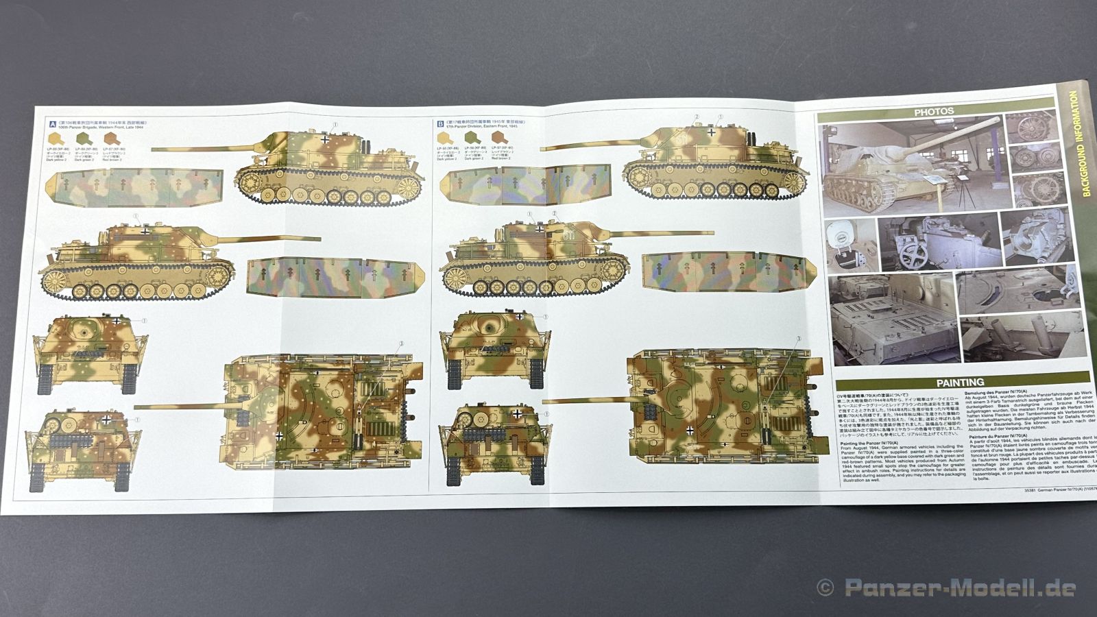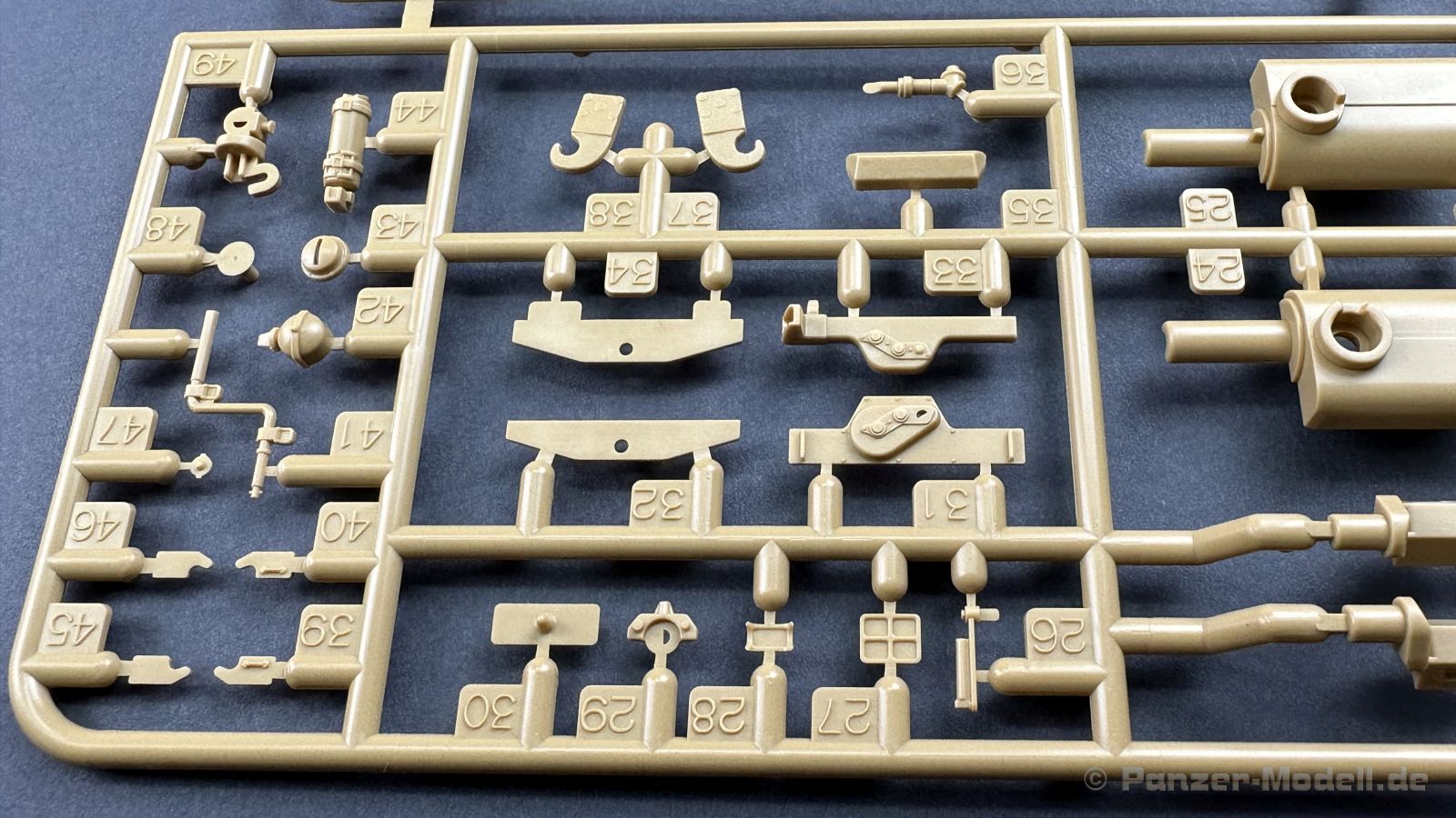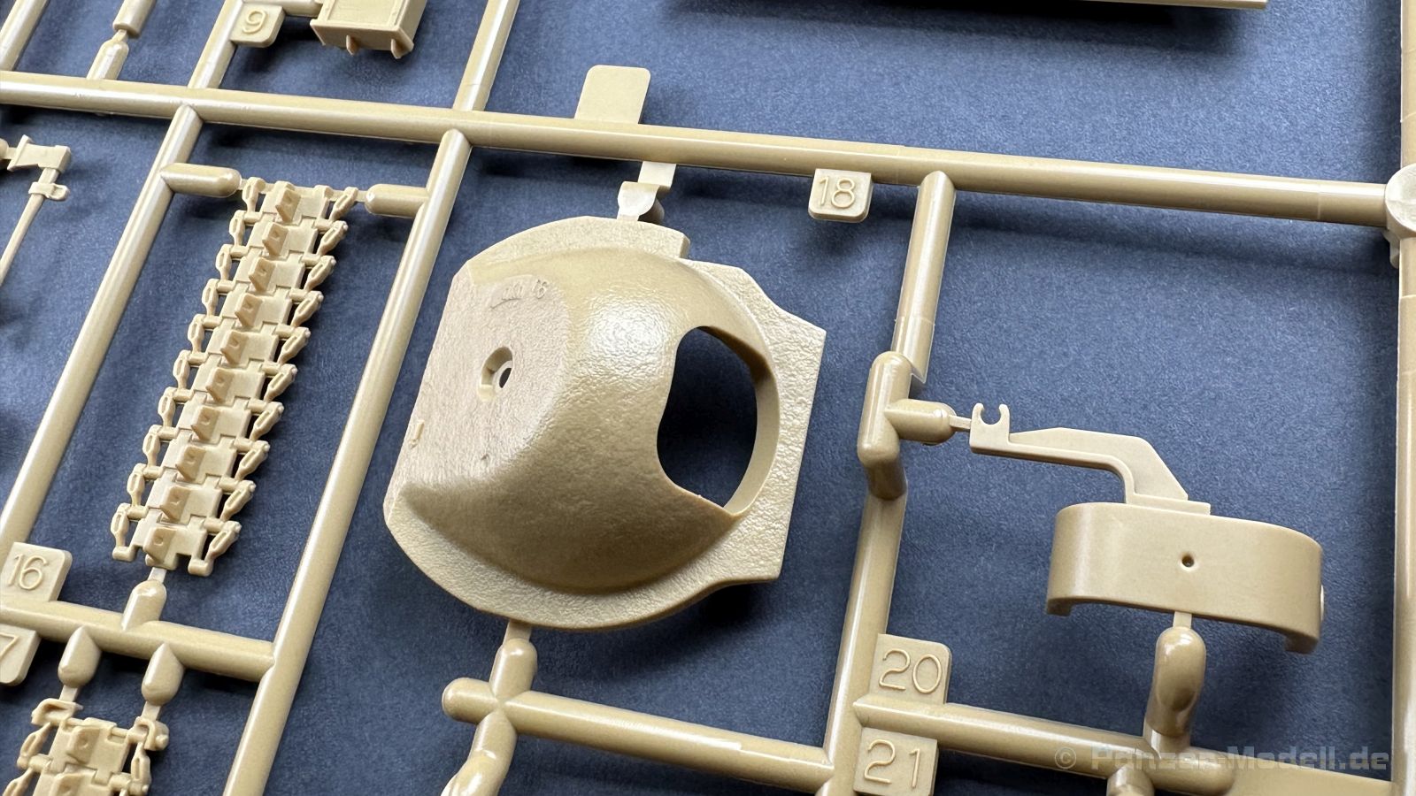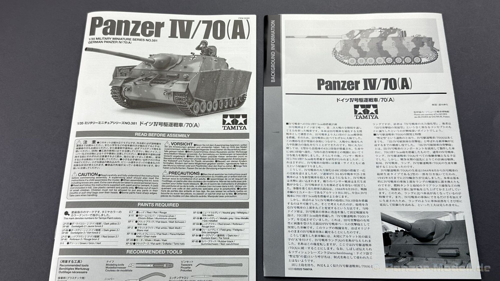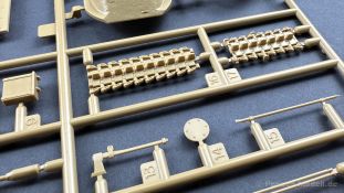 Jagdpanzer IV/70 (A) Schon vor der Spielwarenmesse wurde geleakt das Tamiya wohl einen Jagdpanzer auf Basis von ihrem Panzer IV realisieren möchte, 1-2 „verschwommene Bilder“ tauchten auch auf, aber so richtig wusste halt noch niemand wie der Panzer aussehen sollte bzw. welche Features uns wohl erwarten könnten… Das änderte sich als wir Anfang Februar die Spielwarenmesse zu Nürnberg enterten, da stand die Neuheit von Tamiya in voller Pracht! Doch Neuheit, nun ja sagen wir es einmal so: es ist nur bedingt eine Neuheit, da Teile vom Jagdpanzer vom bereits 2014 erschienen Jagdpanzer IV L70 (V) 35340 sind. Neu ist natürlich der obere Aufbau, der ja für die Alkett Version des Jagdpanzers IV angepasst worden ist und erfreulicherweise sind die übrigen Teile noch einmal einem Facelift unterzogen worden. Als Modell wird hier die Lösung von Alkett mit dem relativ hohem Aufbau dargestellt, da der Panzer IV mit dem Einbau der 7,5 cm KwK L/48 an seine Leistungsgrenze gekommen ist und aufgrund des limitierten Turmkranzdurchmesser keine größere Kanone aufnehmen konnte, wurde nach einer Lösung gesucht die leistungsstarke 7,5cm KwK L/70 zu verbauen. Mit dem Weglassen des Turmes und einer Veränderung vom Panzerkastenaufbau, ähnlich des schon bekannten Sturmgeschütz Konzeptes wurde der Jagdpanzer IV realisiert. Mit dem Bau wurde erst relativ spät begonnen, von August 1944 bis März 1945 konnten immerhin aber noch 277 Exemplare sowie ein Prototyp fertiggestellt werden. Zusammenfassend lässt sich sagen das der Jagdpanzer IV in V und A ein Erfolg war, sofern richtig eingesetzt, die relativ starke Frontpanzerung sowie die sehr starke und präzise 7,5cm L/70 standen dem völlig überlastenden vorderen Fahrwerk ( daher auch die Stahllaufrollen ) Getriebeproblemen und dem permanenten Spritmangel entgegen. Im Bausatz enthalten sind insgesamt: - 7 Spritzlinge - Ätzteilebogen für die Gitterschürzen ( Thomaschürzen ) - 3 Sorten Polycaps - Segmentkette - 1x Figur - 2x Decalvarianten Die Spritzlinge kommen in dem für späte deutsche Fahrzeuge typischen dunkelgelben/beigen Farbton daher und sind, wie es im englischen so schön heißt von den Details crisp – also absolut scharkantig abgegossen. Im allgemeinen gefallen wir die neuen Bausätze von Tamiya spitze, so wird auch hier darauf wert gelegt das wir eine Oberflächenstruktur haben die absolut angemessen ist, Schweißnähte und eine absolut durchdachte Vorgehensweise runden das Bild ab. Die Jungs von Tamiya müssen das Fahrzeug in Saumur mir Adleraugen vermessen haben, so wurden viele Merkmal exakt von diesem Fahrzeug wie die schon genannten Oberflächenstruktur übernommen, ebenso die Kette, welche eine späte, seltene Variante ist. Gut für uns, so kommt etwas Abwechslung auf den Basteltisch. Apropos Kette, hier hat Tamiya wieder sein ganzes können in die Waagschale geworfen, die Segmentkette weist Führungshilfen und eine 1a durchdachte Montage auf. Leider finden sich auf den Gummibandagen der hinteren Laufrollen keine Herstellerangaben wie Semperit, Fulda und Co auf, ich finde das könnte man in 2023 besser machen, zumal beim Original vermessen Fahrzeug in Saumur eben jene Daten zu sehen sind. Eine Figur , bzw. eine ¾ Figur liegt dem Bausatz ebenfalls bei, in Tamiya typischer Pose, relativ neu sind die modulare Bauweise ähnlich dem Dragon Gen 2 Konzept, ist zwar ein wenig aufwendiger, aber das Ergebnis ist dadurch wesentlich besser. Die Anleitung gibt insgesamt 33 Baustufen vor. Leider spendiert Tamiya nur 2 Decalvarianten, die da wären: - A 106th Panzer Brigade Western Front, Late 1944 in Dreifarbtarnung / Hinterhalt - B 17th Panzer Division, Eastern Front 1945 Dreifarbtarnung Zu finden sind die beiden Bemal Vorschläge auf einem separaten Bogen, der auch Hintergrundinformation ( in Deutsch, Englisch, Französisch und Japanisch ) sowie einige Bilder, ja sogar Bilder in Farbe enthält. Im Allgemeinen kann man die Anleitung von Tamiya gar nicht oft genug loben, alles bestens erklärt, mit Bildern untermalt und an vermeintlich kniffeligen Stellen nochmals als Bild oder Zeichnung untermauert. Das Kanonenrohr für die L/70 liegt als einteiligen in Kunststoff gespritztes teil bei das mit einem , zum Stück hohl gegossen End teil montiert werden muss. Erwähnenswert sind die Gitterschürzen die hier als Ätzteil auf einem , für Tamiya eher untypischen , großen Bogen daher kommen, absolut lobenswert!! Tamiya hat sich, zumindest auf dem Papier, schlüssige Konzept überlegt, wie man die Ätzteile mit den Kunststoffteilen verbinden kann überlegt. Die Praxis wird zeigen, ob das gut funktioniert oder ähnlich kompliziert wird wie bei Dragon damals Ich denke in der Zusammenfassung lässt sich sagen das dem geneigten Modellbauer hier ein Modell an die Hand gegeben wird, das sich A gut bauen lassen sollte, B gut recheriert ist und sich aufgrund der Beigaben so aus der Schachtel bauen lassen sollte. 2 minimale Minuspunkte möchte ich nicht unerwähnt lassen, lediglich 2 Decalvarianten und das fehlen von Details auf den Gummibandagen Absolut löblich ist der Preis, zumindest jetzt bei Erscheinen An dieser Stelle möchte ich mich bei Tamiya / Deutschland bedanken die uns hier das Muster zur Verfügung gestellt haben.