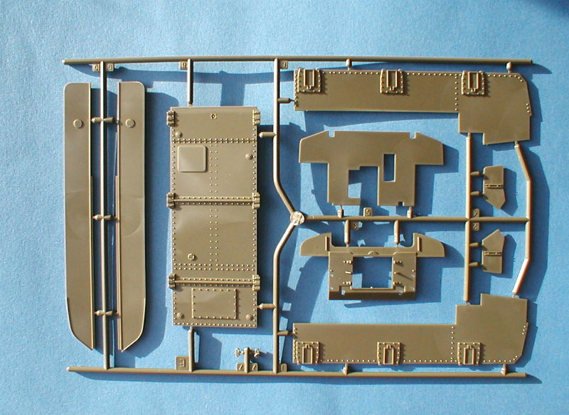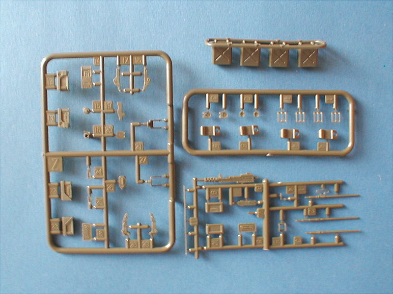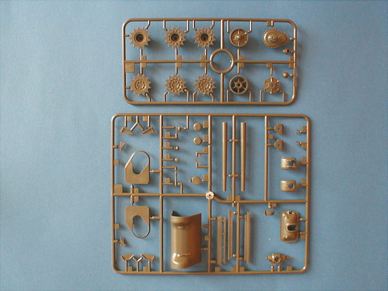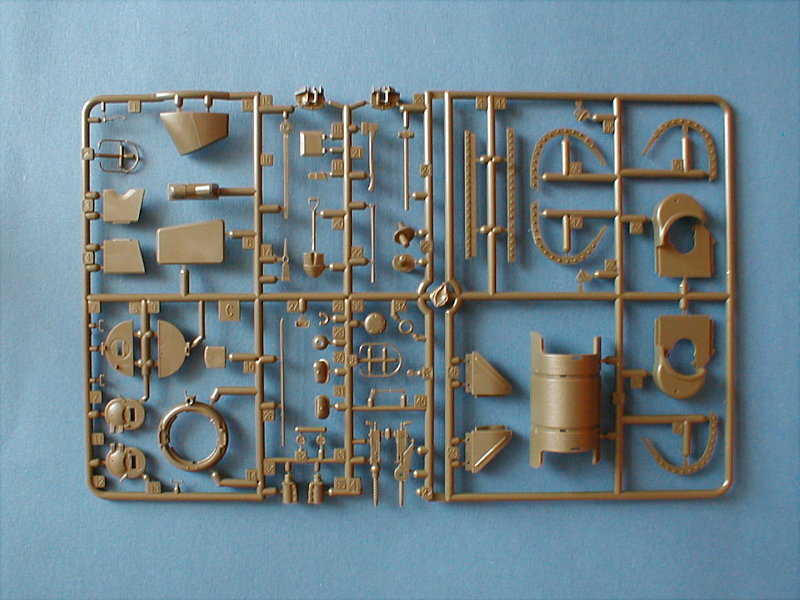 Die allgemeine Gussqualität kann man nur als sehr gut bezeichnen. Auch die Detaillierung ist sehr hoch angesetzt. So besteht z. B. die Möglichkeit unter zwei Varianten für das Cal. 50 Mg auszuwählen. Das MG besteht dann aus insgesamt 6 Bauteilen. Auch bei den Munitionskästen hat man die Qual der Wahl bei der Ausführung. Eine Kiste besteht dann aus bis zu 5 Bauteilen. Die Oberflächenstruktur von Wanne und Turm ist ebenfalls sehr schön dargestellt, beim Fahrgestell sind z. B. Optionsmöglichkeiten bei der Auswahl der Laufrollen gegeben. Es liegt sogar eine Figur für den Kommandanten bei. Faltenwurf der Kleidung und Körperhaltung wirken sehr natürlich.