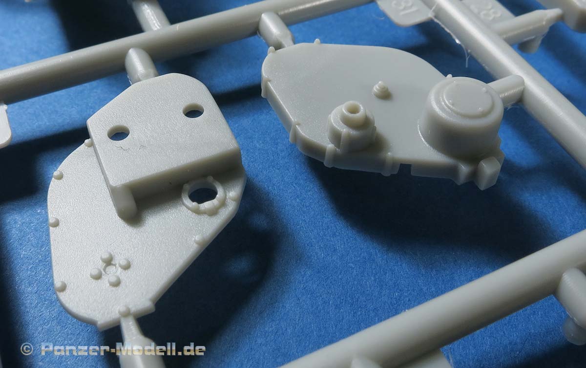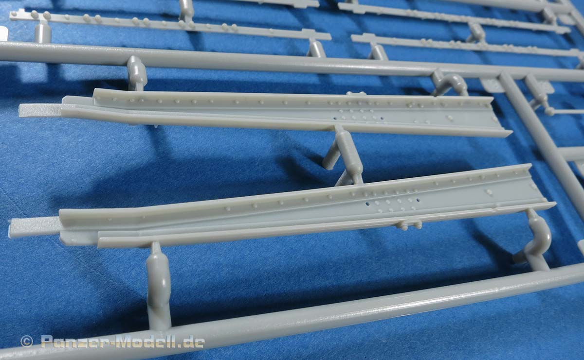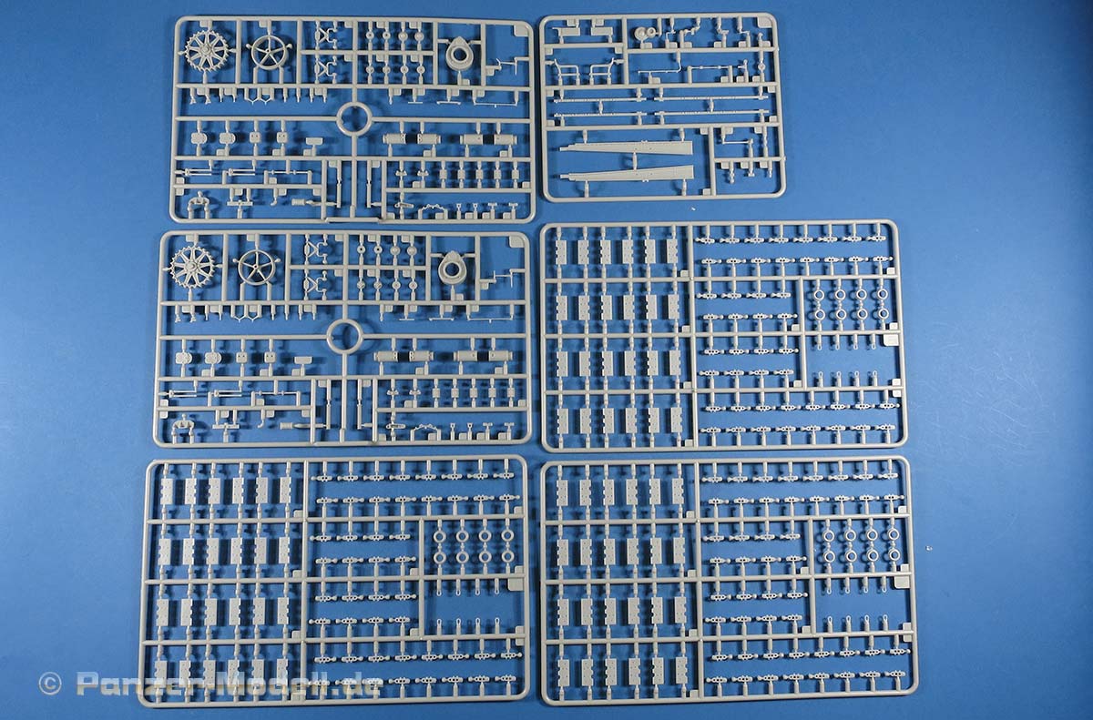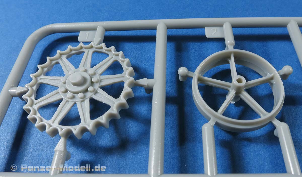 Das Laufwerk baut sich aus je zwei Längsträgern zwischen denen die 5 Laufrollen eingebaut werden. Die Laufrollen setzen sich aus je drei Einzelteilen zusammen. Treibrad und Leitrad sind sehr schön gespritzt und einteiig, wobei das Leitrad mit in eine mehrteilige Halterung eingebaut werden muss.