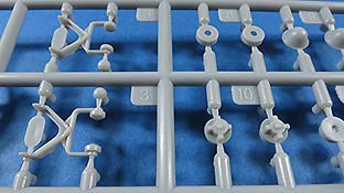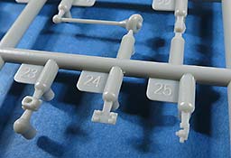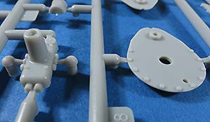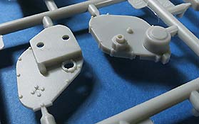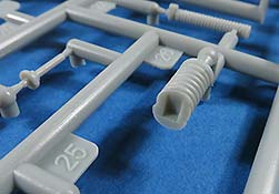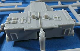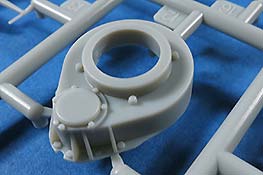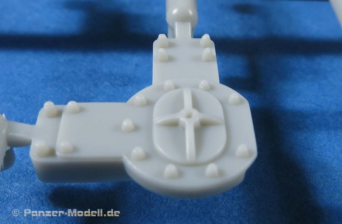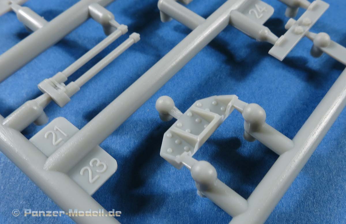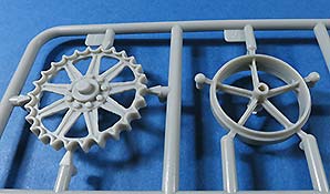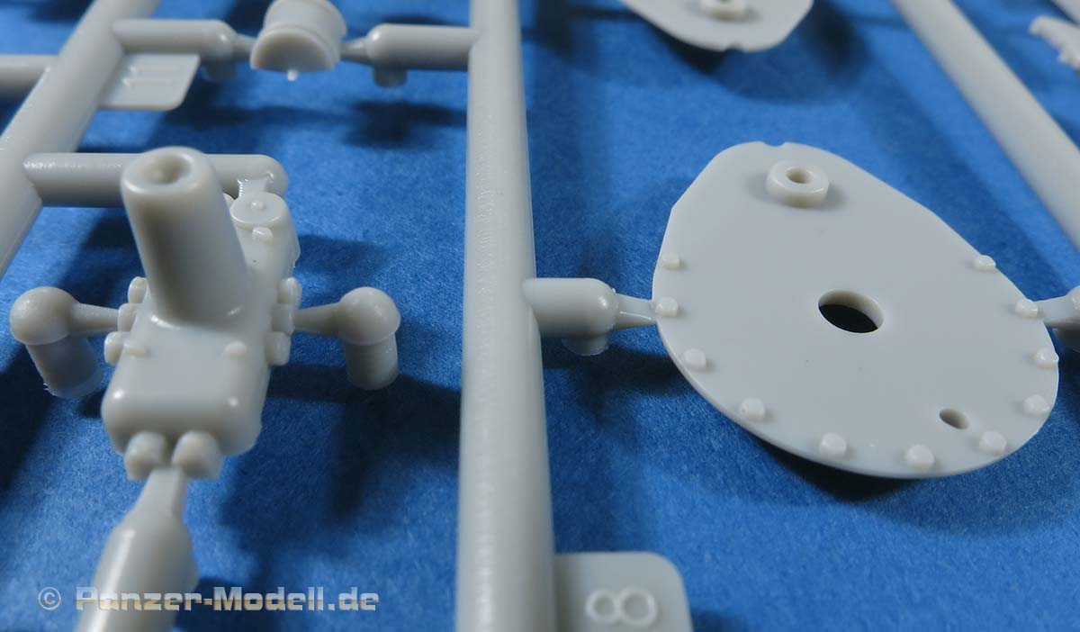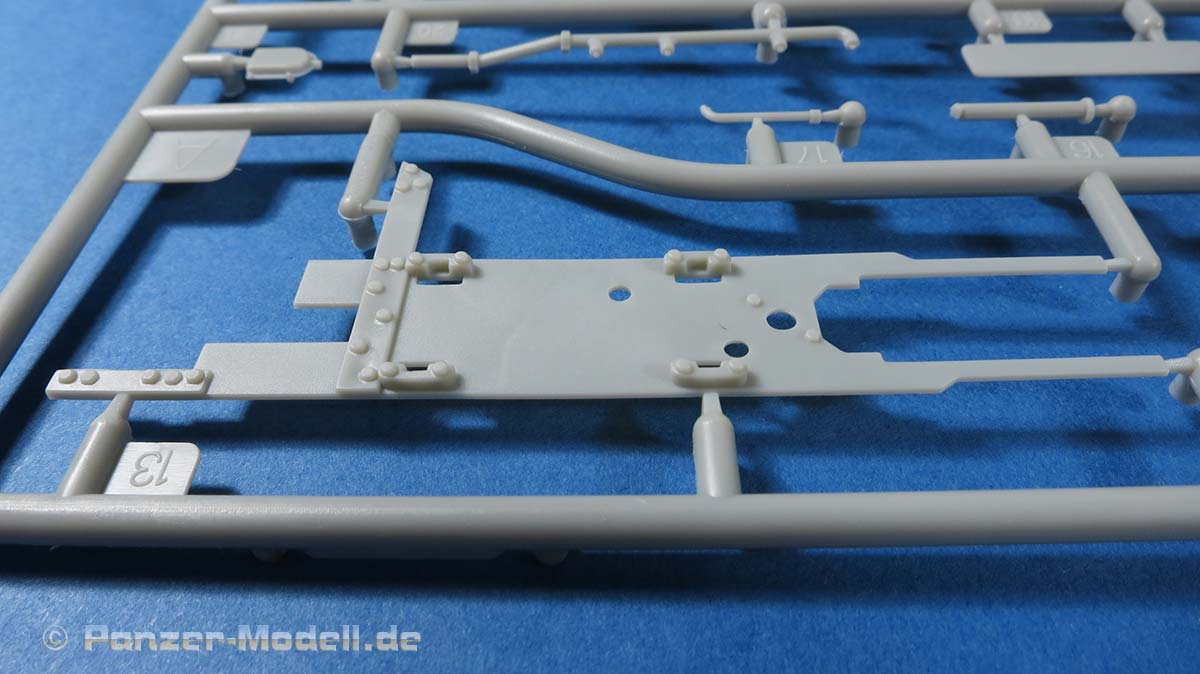 Das Laufwerk baut sich aus je zwei Längsträgern zwischen denen die 5 Laufrollen eingebaut werden. Die Laufrollen setzen sich aus je drei Einzelteilen zusammen. Treibrad und Leitrad sind sehr schön gespritzt und einteiig, wobei das Leitrad mit in eine mehrteilige Halterung eingebaut werden muss.