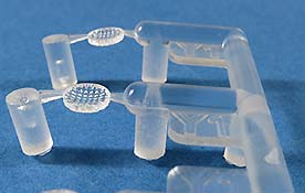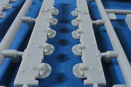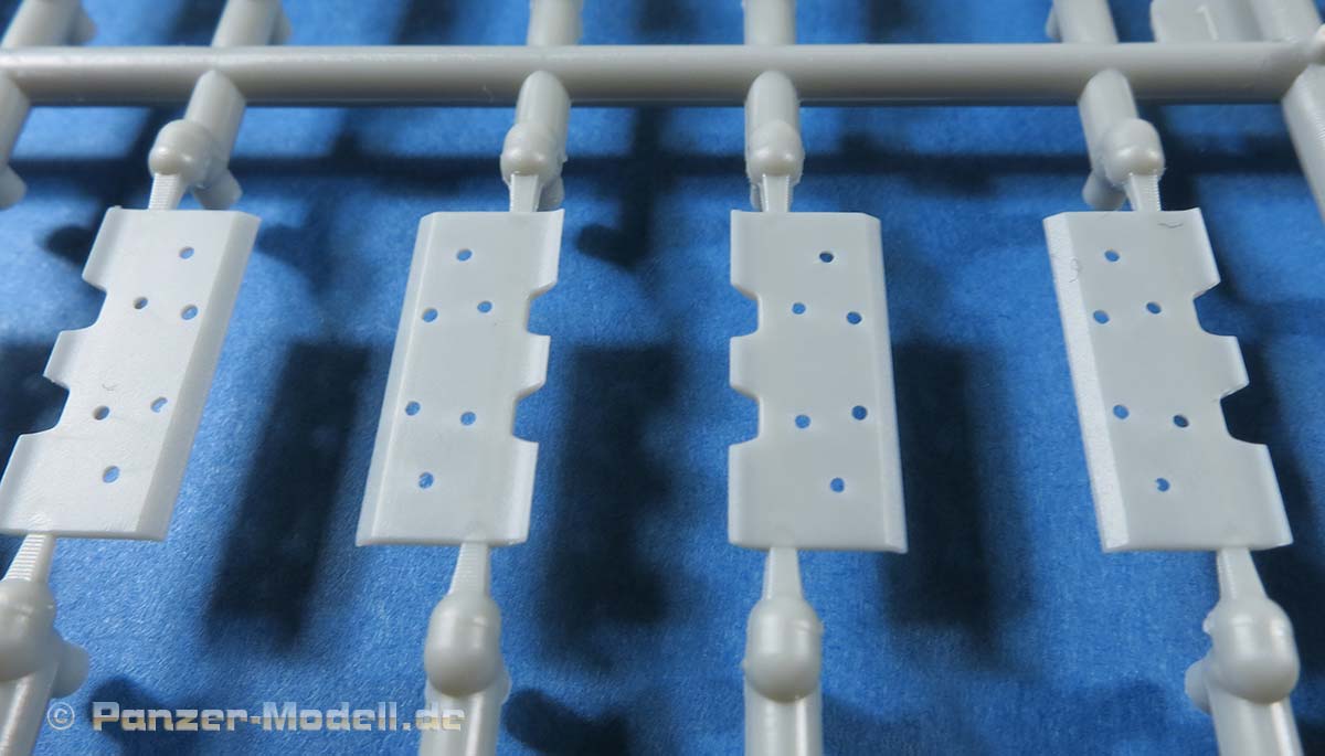 Die Ketten bestehen aus schön gemachten Einzelgliedern, die sauber gespritzt sind und ohne Auswerferstellen. Die Verbindung ließe sich beweglich bauen - die Verbindung erfolgt über zwei Stege mit Bolzen von denen einer in den nächsten greift während beide Stege dann auf ein Kettenglied geklebt werden. Mit 32 Gliedern pro Seite hält sich die Arbeit dann in Grenzen.