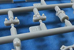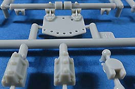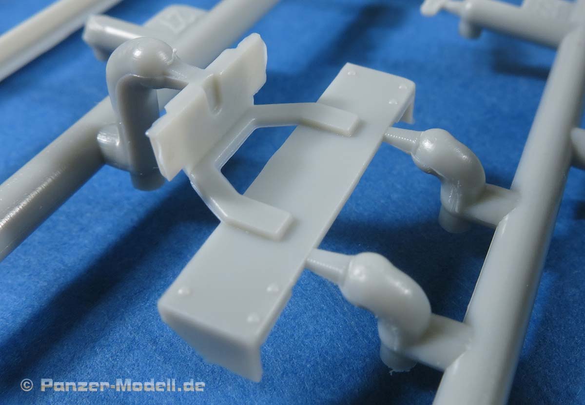 Auch der Fahrerbereich mit Sitz und den ganzen Armaturen ist mit feinen Plastikteilen wiedergegeben. Der linksseitige große, runde Tank ist leider aus zwei Halbteilen zusammenzusetzen und daher unbedingt die Naht zu versäubern.