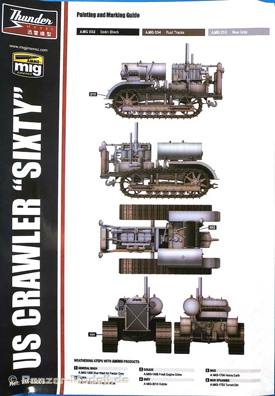 Auf einem extra beiliegenden doppelseitig farbig gedruckten Hochglanz DIN A4 Bogen sind insgesamt drei Bemalungssoptionen in Mehrseitenansichten. Markierungen gibt es nicht, denn es liegen keine Decals bei. Die Farbangaben sind für Amig Farben.