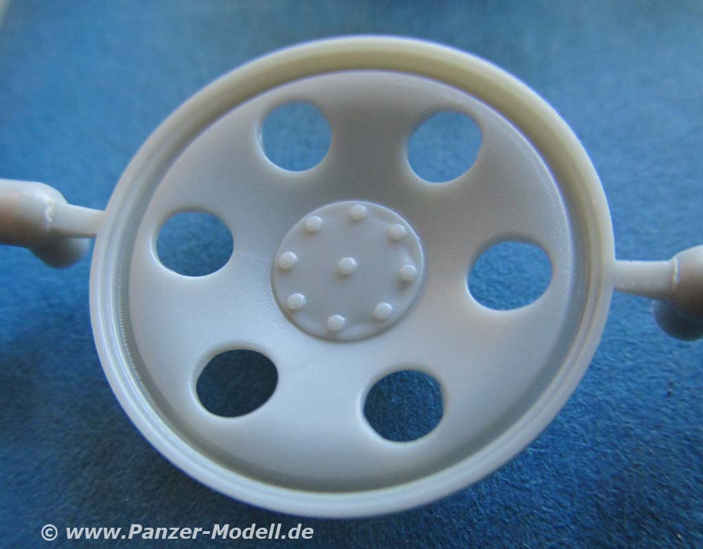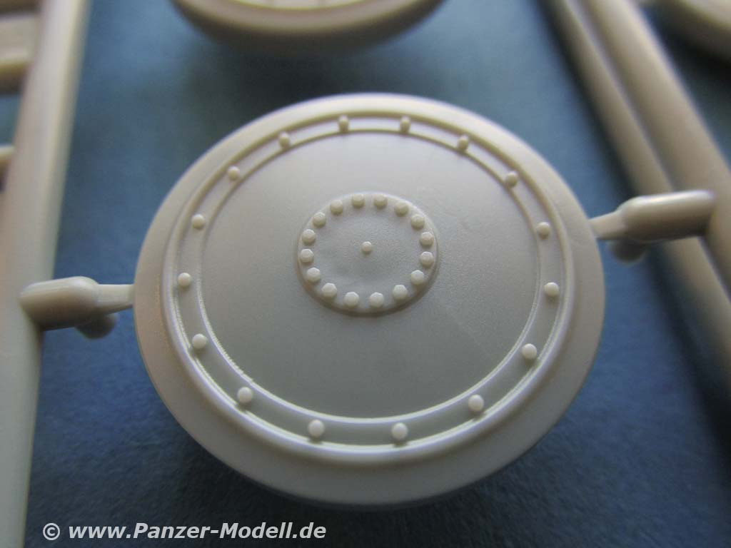 Die Laufrollen sind sind dafür einteilig und sehr schön detailliert dargestellt mit den 16 Radbolzen und entsprechender Radabdeckung. Auch das Leitrad macht einen sehr guten Eindruck mit den 6 Löchern, wie es sich für eine späte Version gehört und sehr feinen, hauchzarten versenkten Schraubenköpfen.