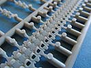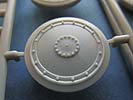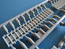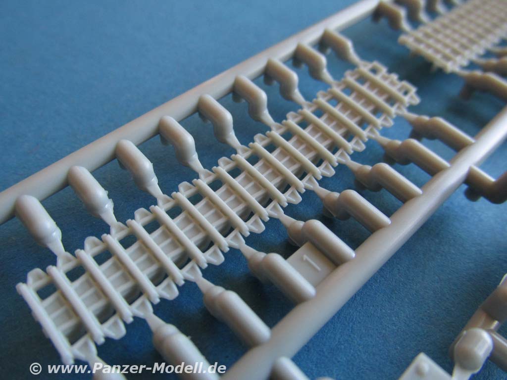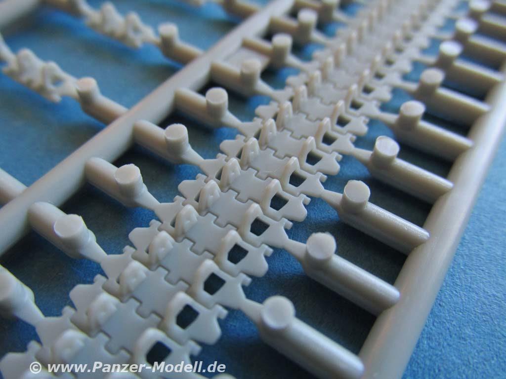Die Ketten sind Segmentketten, d.h. für Ober und Unterseiten liegen die Ketten bereits als zusammengebaute, starre Stränge vor, nur für die Umläufe um Treib und Leitrad sind einzelne Kettenglieder im Spritzling. Die Darstellung der Ketten ist sauber, im Aussenbereich vielleicht ein Hauch zu soft in der Kantenschärfe. Die Segmentstränge machen ansonsten aber einen guten Eindruck und sind für den oberen Bereich entsprechend durchhängend dargestellt.