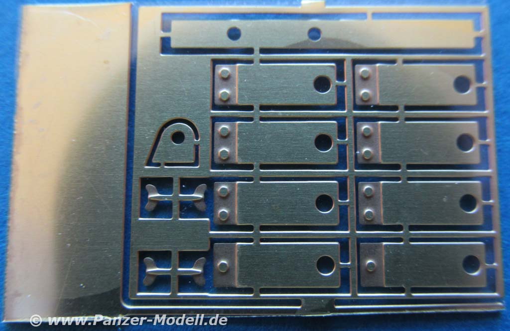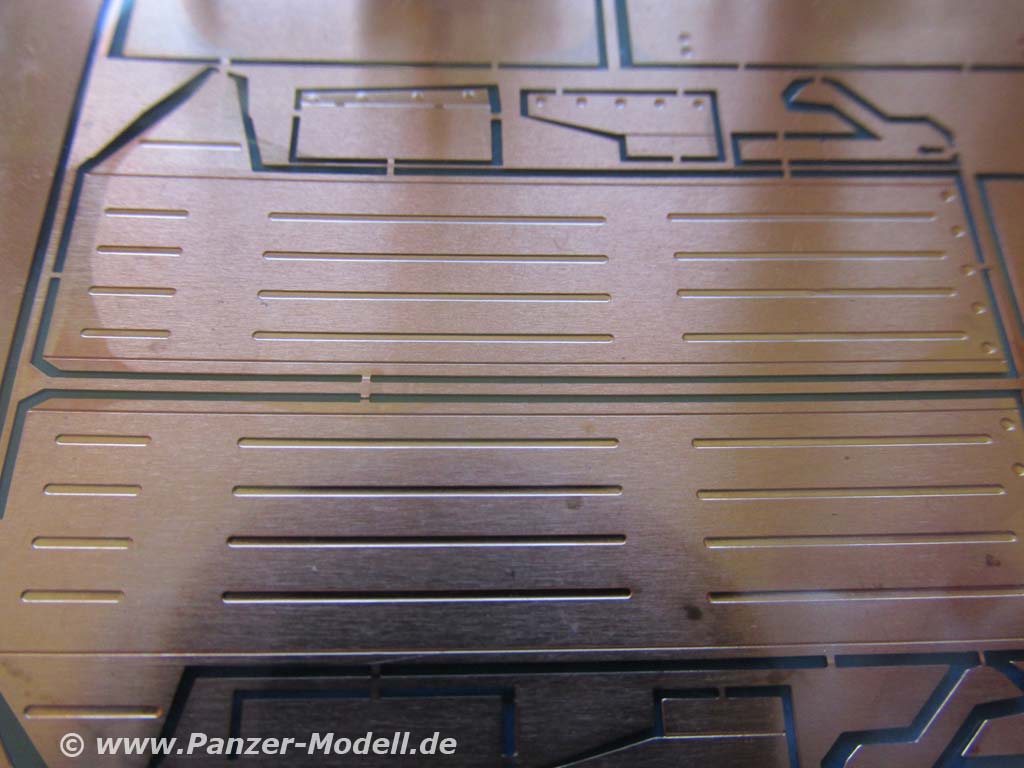 Die kurzen Stücke Kettenbleche für den hinteren Bereich kann man hier wahlweise aus den beiliegenden Plastikteilen oder aus PE Blechen bauen. Die Version mit den PE Blechen ist definitiv aufwändiger, sieht aber am Ende realistischer aus und lässt die Möglichkeiten von Beschädigungen einfacher erscheinen.