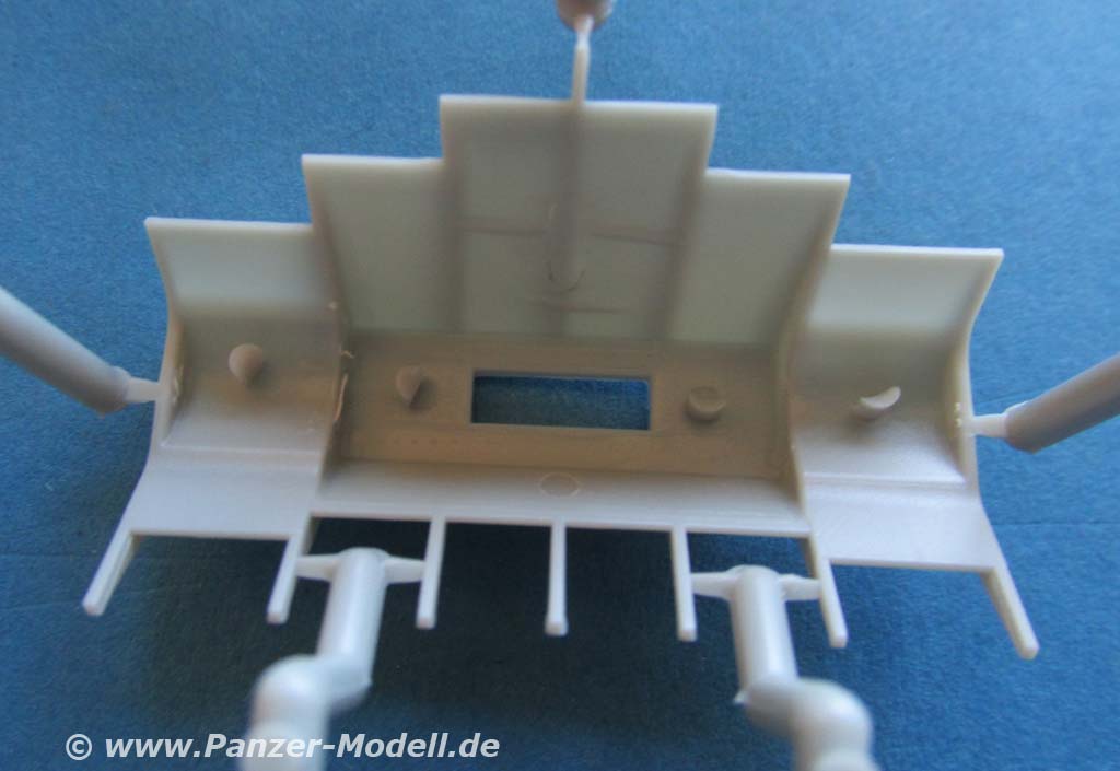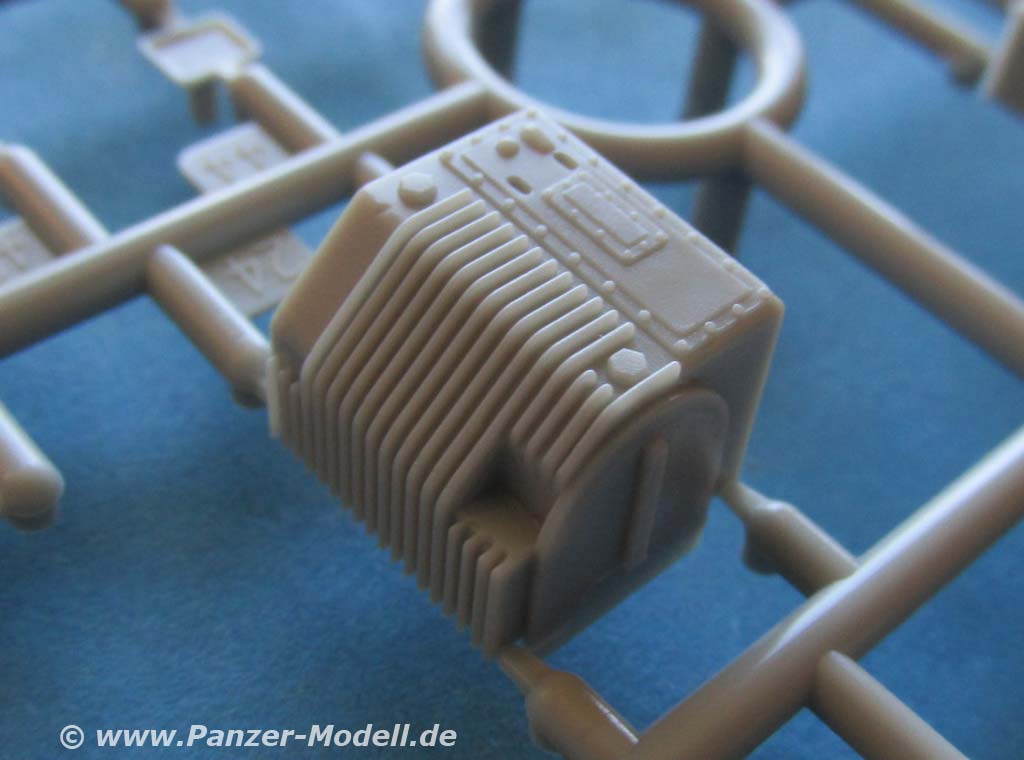 Der Motor setzt sich aus einigen Einzelteilen zusammen, die recht ordentlich detailliert sind und es gibt zusätzlich für den Motorraum Teile für die Tanks, Luftfilter, Sammler, Kühler und Lüftergebläse.