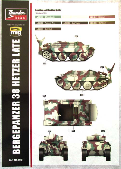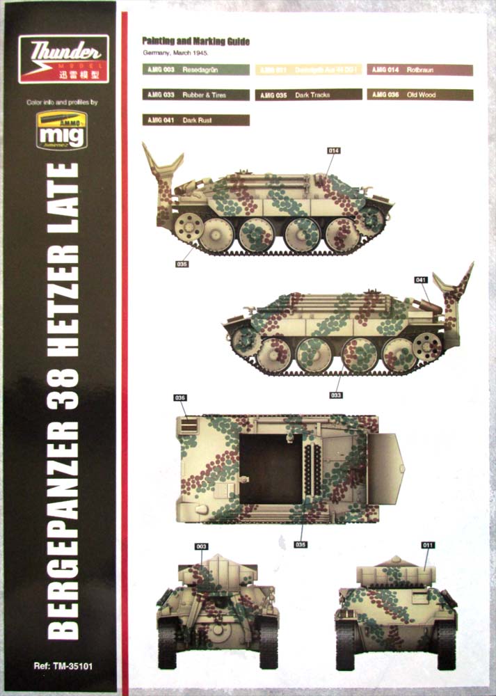 Auf einem extra beiliegenden doppelseitig farbig gedruckten Hochglanz DIN A4 Bogen sind zwei 5-Seiten Ansichten zu Bemalungsmöglichkeiten des Bergehetzers. Die Farbangaben sind für Farben von Ammo by Mig.