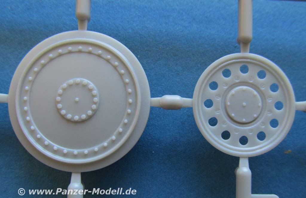 Die Laufrollen sind sind dafür einteilig und sehr schön detailliert dargestellt mit den 32 Radbolzen und entsprechender Radabdeckung. Auch das Leitrad macht einen sehr guten Eindruck mit den 12 Löchern und sehr feinen, hauchzarten versenkten Schraubenköpfen.