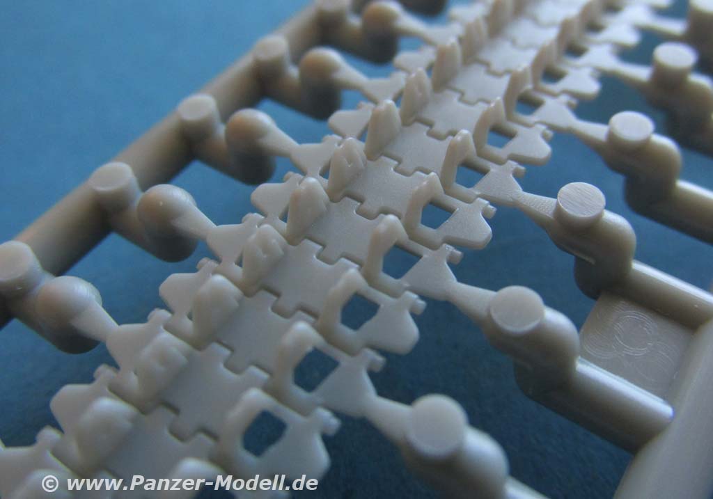 Die Ketten sind Segmentketten, d.h. für Ober und Unterseiten liegen die Ketten bereits als zusammengebaute, starre Stränge vor, nur für die Umläufe um Treib und Leitrad sind einzelne Kettengleider im Spritzling. Die Darstellung der Ketten ist sauber, im Aussenbereich vielleicht ein Hauch zu soft in der Kantenschärfe. Die Segmentstränge machen einen guten Eindruck und sind für den oberen Bereich entsprechend durchhängend dargestellt.