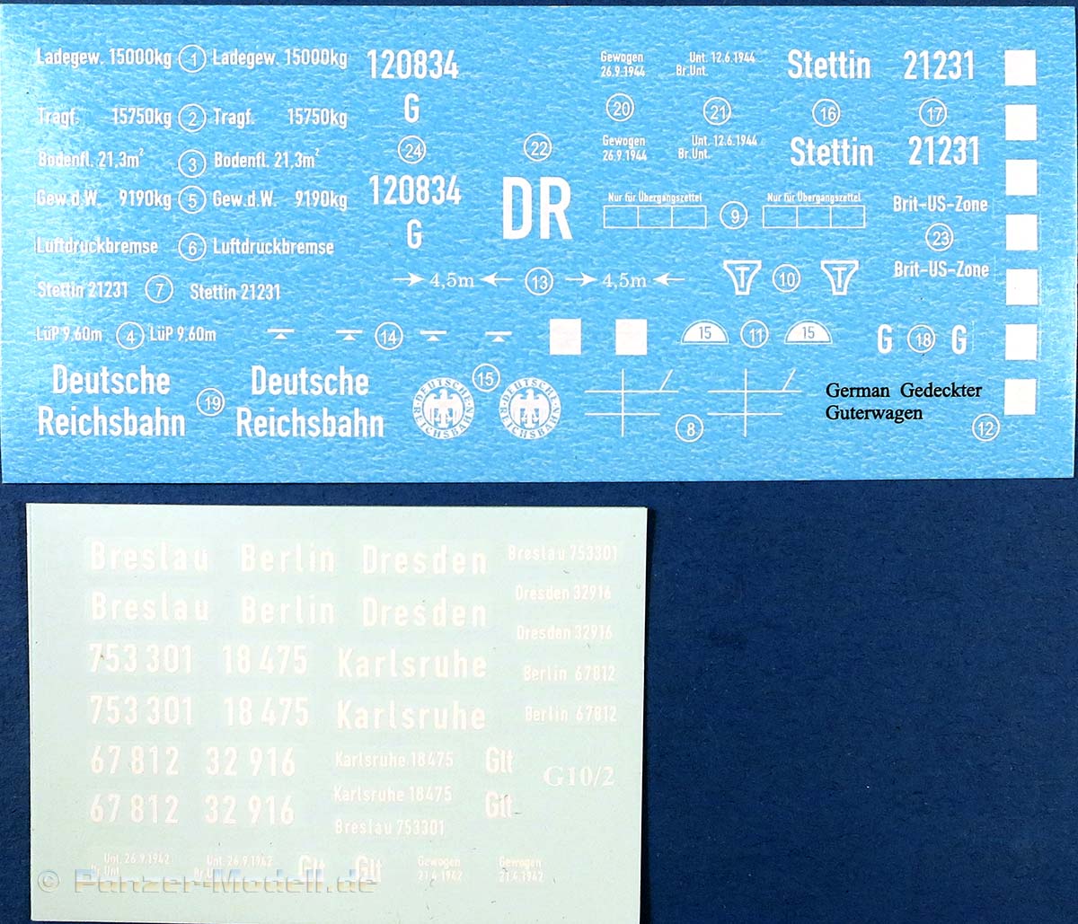 Auf einem extra beiliegenden doppelseitig farbig gedruckten Hochglanz DIN A4 Bogen sind eine Dreiseitenansicht mit grundsätzlichen Markierungen des Waggons bei der Reichsbahn und auf der Rückseite vier Seitenansichten mit weiteren Markierungen. Die Farbangaben sind für Farben von Ammo by Mig. Die Decalbögen geben reichlich Optionsmöglichkeiten