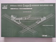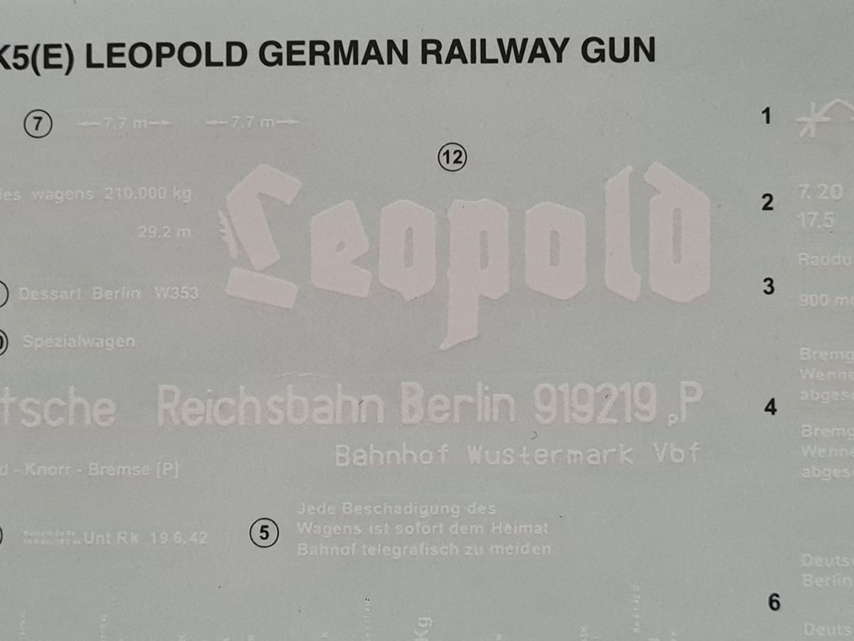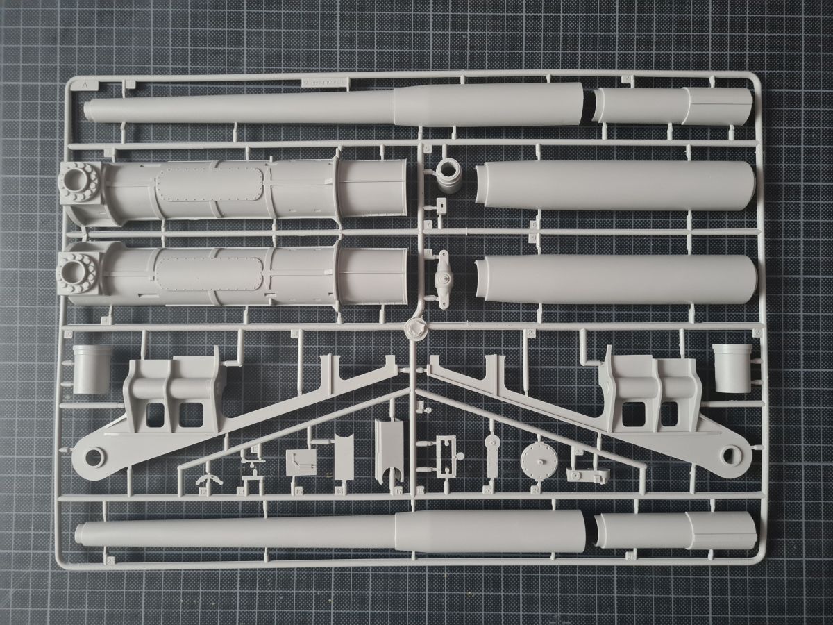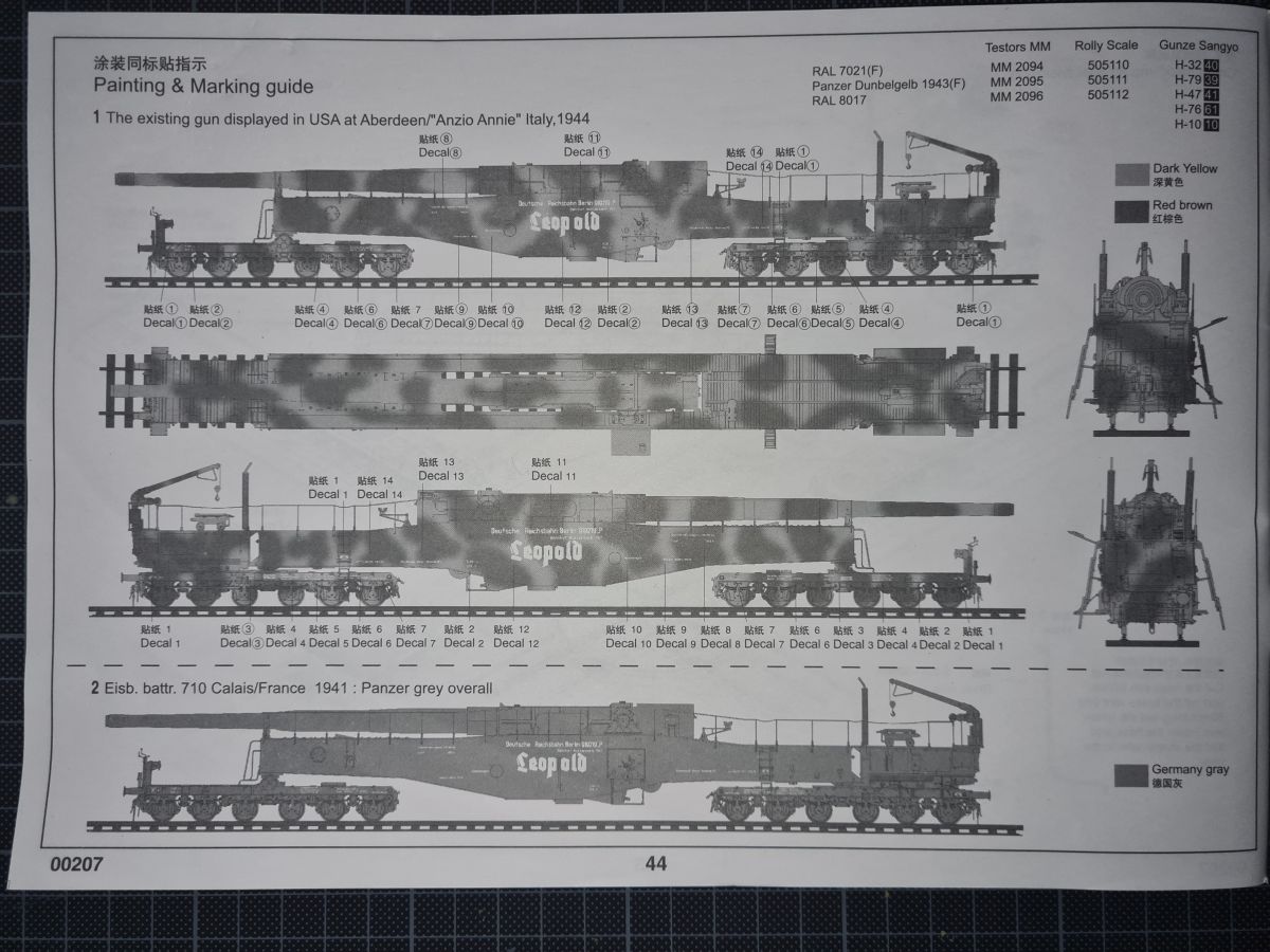 Beim Öffnen des doch recht großen Kartons, finden sich 20 Spritzgussrahmen für das Rohr, die Rohrwiege mit Rahmenlafette und die beiden Drehgestelle auf denen die Lafette aufgesetzt wird. Weiterhin finden wir 4 Spritzgussrahmen für die Darstellung der Schienen und die beiden Oberteile der Drehgestelle. Zu guter Letzt haben auch noch 3 mehr oder weniger große Kartons platz. In diesen befinden sich neben dem Gleisbett und der Drehscheibe, gut verpackt in eine extra Schutzhülle die Teile der Rahmenlafette und im Kleinsten der drei Kartons, 18 Polycaps, eine Ätzteilplatine, 2 Metallzylinder (zur Aufnahme des Rohres in der Rohrwiege), eine feingliedrige Metallkette, ein Stück Kupferdraht, ein Stück Faden und ein Gummischlauch. Abschließend zu diesem Potpourri aus den verschiedensten Materialien der Modellbauwelt finden wir noch einen Decalsatz, aber dazu später mehr. Macht in der Summe ca. 1200 Plastikteile und diverses Kleinmaterial. Der erste Eindruck der Teile und Spritzlinge ist, trotz des Alters, in sehr guter und bekannter Trumpeterqualität. Feine Details, detaillierte Holzmaserung und selbst auf den kleinsten Teilen sind erhaben gegossene Schriftzüge zu erkennen. Die Schienen- und Gleisbettsegmente sind mit allen anderen von Trumpeter gefertigten, schienengebunden Modellen, identisch und somit ist eine Erweiterung, zum Beispiel mit der WR 360 C12 Lokomotive (Nummer TRU00216) ohne Probleme möglich. Die Bauanleitung ist als kleines Heft ausgeführt und beschreibt den Bau detailliert auf 44 Seiten. Der Bemalungsguide ist in schwarz-weiß gehalten, jedoch ist auf der Kartonverpackung nochmal alles in Farbe abgebildet. Die Gesamtlänge des Modells wird von Trumpeter mit knapp 96cm angegeben, wobei bei Nutzung des Drehtellers und der mitgelieferten Schienen eine Länge von etwas mehr als 100cm erreicht wird. Und zwar im 90° Winkel, in 2 Richtungen, je 100cm! Die Höhe wird laut Verpackung mit 16cm und die Breite mit knapp 13cm benannt, wobei die Höhe mit gesenktem Rohr gemeint ist. Vorsichtig geschätzt wird bei Schussposition eine Höhe von ca. 40cm erreicht. Das Geschützrohr lässt sich beweglich bauen und auch die Drehgestelle bleiben beweglich. Für die Darstellung wird dem Modellbauer eine Variante auf geradem Gleisbett ober aber auf einer Drehscheibe angeboten. Letztere macht sicher viel her, kostet aber auch entsprechend Platz. Ein doch recht auffälliges Problem und wohl der größte Kritikpunkt ist der Decalsatz. Dieser strotzt nur so von Rechtschreibfehlern und kostet dem besten Modell viel an Glanz. Man kann sicher mit Verschmutzung und Alterung des Modells arbeiten und somit die Fehler vertuschen, aber jeder Heim- und Handwerker kennt dieses Gefühl, dass man einen Fehler oder eine nicht so gelungene Stelle immer wieder im Blick hat. Wer viel Wert auf Detaillierung legt, sollte sich zum Beispiel die Zurüstsätze der Firma Schatton ansehen. Außer einem gedrehten Alugeschützrohr (Schatton Art.Nr.: 3510, ca. 33€), bietet dieser Hersteller auch noch ein Set aus 2 Granaten und den passenden Treibladungskartuschen an (Schatton Art.Nr. 3511, ca. 12€). Auch eine Überlegung wert ist der Decalsatz von Peddinghaus (Peddinghaus Art.Nr.: 0905, ca. 12€), der auch nicht gänzlich fehlerfrei daherkommt aber doch etwas besser scheint. Trumpeter hat natürlich auch nicht vergessen, dass für den Einsatz des Geschützriesen eine Besatzung von Vorteil wäre und spendiert unter der Nummer TRU00406 eine 8-köpfige Bedienmannschaft, je nach Bezugsquelle für ca. 15€. Fazit: Ein recht imposantes Modell, das nicht nur eine Menge Bastelspaß verspricht, sondern auch den ein oder anderen geneigten Modellbauer am Ende vor ein Platzproblem stellen wird. Die Detaillierung, sowie der Teileumfang rechtfertigen den Kaufpreis für um die 100€ auf jeden Fall. Ein echter Hingucker in jeder Modellbausammlung ist es allemal.