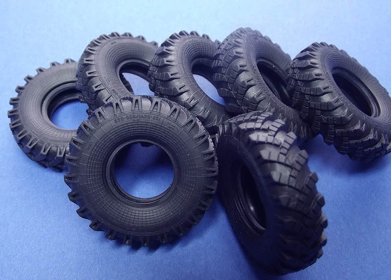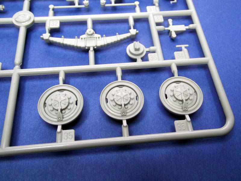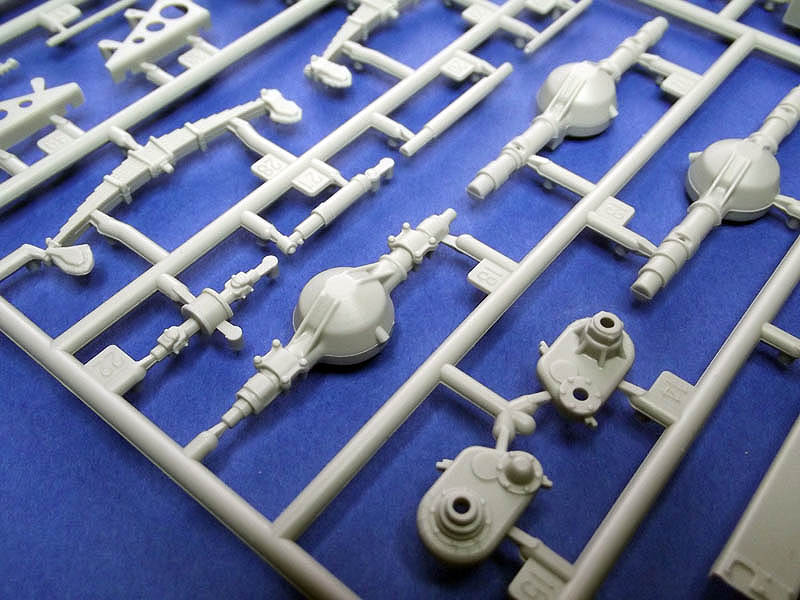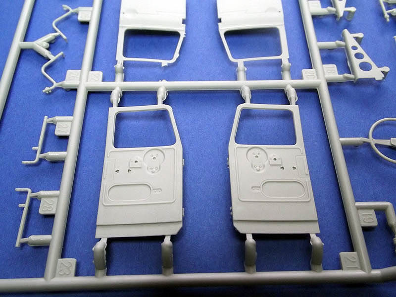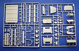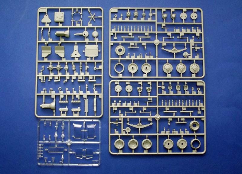 Der Bausatz beinhaltet 8 Spritzlinge, davon 1x Klarsichtteile für die Scheiben und Beleuchtungseinrichtungen, einen Satz sehr schöner Vinylreifen, zwei Platinen mit PE Teilen und einem kleinen Decalbogen. Insgesamt enthält der Bausatz über 240 Bauteile. Das Deckelbild zeigt den Lkw mit Planenaufbau über der Ladefläche. Im Bausatz sind aber weder die Plane noch die Spriegel enthalten. Wer also die Hoffnung hatte das Modell mit Plane bauen zu können muss sich enttäuschen lassen. Bei Trumpeter ist es mittlerweile zum Standard geworden dass die Bauteile in hoher Fertigungsqualität gestaltet werden. Auch bei diesem Modell sind die Bauteile in sehr guter Qualität gegossen und mit schönen, scharfen Details ausgestattet. Der Guss ist sehr sauber ausgeführt. Der Bausatz bietet alles, was der fortgeschrittene Modellbauer heutzutage erwartet: Einen sehr gut detaillierten Fahrwerksrahmen, ein gut ausgestattetes und detailreiches Fahrerhaus, einen nahezu vollständigen Motor mit Kühler, Lüfter, Getriebe und Antriebswellen. Die Holzbretter an den Ladebordwänden verfügen innen wie außen über eine sehr feine Holzstruktur. Schaut man sich jedoch die Baustufen 10 11 in der Anleitung an so scheint die Vorderachse keinen Lenkeinschlag zu ermöglichen da die Felgen auf ein starren Stummel der Vorderachse aufgesteckt werden müssen. Schade, gerade die eingeschlagene Lenkung verleiht einem Radfahrzeugmodell doch eine gewisse Dynamik. Eventuell kann man den Lenkeinschlag aber mit geringer Nacharbeit erreichen, schauen wir mal... Das Fahrerhaus wird aus mehreren Bauteilen zusammengesetzt und beinhaltet die Inneneinrichtung mit Sitzen, Armaturen, Lenkrad und Hebeln. Die Türen sind separat einzubauen und könne offen oder geschlossen montiert werden. Sie verfügen auch über detaillierte Innenseiten mit Verkleidungen, Fensterkurbeln usw. Zwei kleine Platinen mit PE-Teilen bieten sinnvolle Bauteile, z. B. für die Reifenabdeckungen, für die Keilriemen des Motors, für die Reserveradhalterung usw. Nicht zu viel, aber auch nicht zu wenig... Die Vinylreifen haben ein grandioses Profil und sehr schöne Details und Schriftzüge an den Reifenflanken. In der Mitte des Profils befindet sich jeweils eine ganz kleine Naht die sich recht leicht entfernen lassen sollte.
