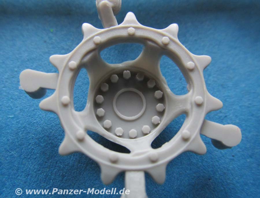 Die Unterwanne ist einteilig und wird mit den Schwingarmen versehen, die einzeln in die Wanne eingeklebt werden - d.h. kein bewegliches Laufwerk. Die Laufrollen sezuen sich aus zwei Halbteilen zusammen auf die die Gummierung jeweils als einzelnes Teil aufgesteckt/geklebt wird - dies erleichtert die Bemalung/Maskierung erheblich. Die Detaillierung der Felgen sowie der Treib- und Leiträder ist ganz ausgezeichnet.