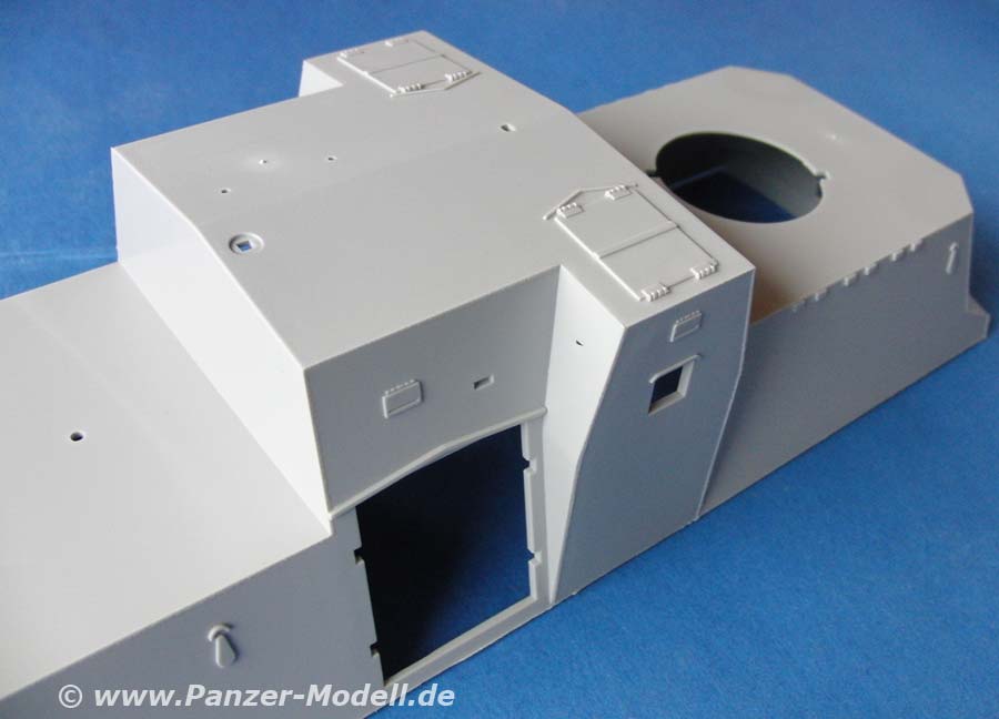 Der Bausatz besteht im Groben aus der Ober und Unterwanne die erfreulicherweise in jeweils EINEM Teil gegossen sind - ein hoch auf die slide mold Technologie. Die zahl an Details ist überschaubar, was aber daran liegt, dass auch das original mehr oder weniger aus glatten Panzerplatten bestand.