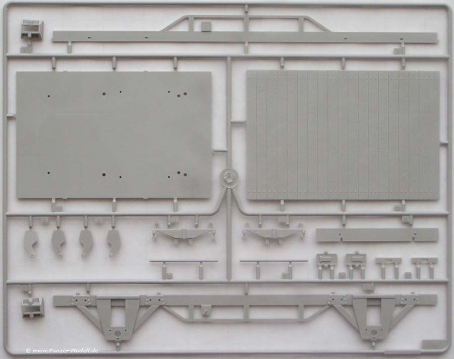 Der Bausatz besteht aus 6 Gießästen für den Waggon, einem Gießast für die Schienen und Schwellen, 5 Teilen für das Gleisbett und einem Decalbogen. Dem geneigten Modellbauer werden die Schienen und das Gleisbett bekannt vorkommen, diese sind ebenfalls bei der Diesellok und den beiden eisenbahnverlasteten Mörsern "Karl" beigefügt. Dieses gibt es auch als separat erhältliches Schienenset.
