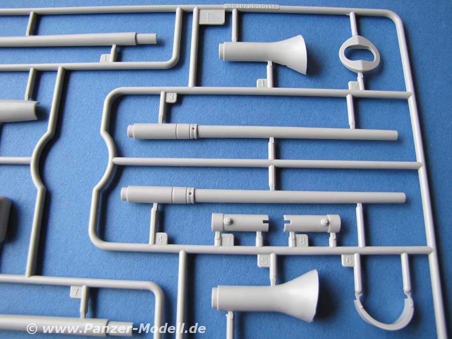 Hauptunterschied zum E-75 ist das Turmlayout. Hier ist der Schmalturm enthalten, der einen guten Eindruck macht und für den zwei verschiedenen Kanonenblenden und verschiedene Rohre zur Vefügung stehen. Die Rohre sind allerdings leider aus zwei Halbteilen zusammenzusetzen, was heutzutage nicht mehr ganz zeitgemäß ist.