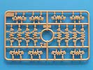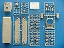 Der Inhalt besteht aus 12 hellgrauen, 12 braunen und einem glasklaren Spritzling. Dazu kommen die obere Turmschale, die Unterwanne, ein Stück verdrillter Kupferdraht, 2 Ätzteilplatinen und ein kleiner Abziehbilderbogen für ein Fahrzeug. Bis auf die Spritzlinge für die Ketten und die der Laufrollen sind alle in separaten Tüten verpackt. Die Unterwanne sitz in einem Extrafach im Karton, das Beschädigungen verhindert.