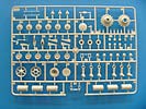 Heute versuche ich mal, die Teile anhand eines Rundganges um das Fahrzeug zu beschreiben. Die Unterwanne besteht aus einen Stück, also Bodenplatte, Seidenwände und Front zusammen. Sie ist bruchsicher im einem Extrafach im Karton unterbracht. Wir entdecken so einige Nieten, Wartungsdeckel und Bodenluken an der Unterseite. Einem umgestürzten KV-8S steht also nichts im Wege. Die Seitenwände sind einfach nur glatt. Dies liegt daran, dass Trumpeter für seine KV-Reihe Standard Unterwannen verwendet, die je nach Ausführung dann entsprechende Seitenwände (in diesem Fall Spritzling WB) mit den passenden Anbauteilen, bzw. den Aufnahmen dafür bekommen. Hier sehen wir auch, dass die Löcher für die Schwingarme 6-eckig sind, d.h. man hat gewissen Spielraum z.B. für ein Diorama, um die Schwingarme aus- oder eingefedert einzubauen. Die separaten Schwingarme bekommen zusätzlich noch je einen Deckel der Stabfederabdeckung. Und wenn wir schon beim Laufwerk sind, erstmalig haben wir nun Laufrollen der mittleren Gussstahlausführung ohne Gummipufferung im Karton, erkennbar an den 6 fast dreieckigen Löchern und den 6 von der Nabe ausgehenden Verstärkungsrippen. Die Laufrollen weisen eine kleine Naht auf, die sich aber leicht beseitigen lassen sollte. Auch die Stützrollen sind in der Stahlausführung ohne Gummibandagierung. Die Stützrollenhalter besitzen 2 Befestigungsstifte, in der Seite sind aber 6 Löcher vorhanden, so viel wie der Halter an Befestigungsschrauben besitzt. Ein Stützrolle samt Halter weglassen (z.B. wegen Beschädigung demontiert), die Kette dort weiter durchhängen lassen, gibt sicherlich einen tollen Effekt, weil ja alle Schraubenlöcher bereits vorhanden sind. Sehr schön sind die einteiligen Anschlagdämpfer mit dem Schraubenende und der Mutter. Die 16-zahnigen Antriebszahnkränze weisen Details wie Schraubenköpfe und Verstärkungsrippen auf allen Seiten auf. In die montierten Antriebszahnräder greift auf jeder Seite ein einteiliger, verwinkelter Schmutzabstreifer ein. (Mein Tip bereits hier: Erst Antriebszahnkranz anbringen, dann den Schmutzabstreifer. Das erspart Flüche und Frust!) Aus je drei Teilen besteht die Kettenspannvorrichtung, die dann das Leitrad trägt. Details wie die Spannschraube sind gut zu erkennen. Darauf kommt die geteilte Kette, die abwechselnd aus einem Glied mit Zahn und einem ohne besteht. Pro Seite werden 88 Glieder für einen Kettenstrang gebraucht. Gemäß den Zeichnungen der Bauanleitung ist ein gewisser Kettendurchhang, wie er bei den KVs oft zu sehen war, dabei bedacht. Wer den Durchhang etwas stärker darstellen möchte, kann dies durch Hinzufügen weiterer Gliederpaare erreichen, da Trumpeter dem Bausatz mehr Glieder beigefügt hat als standardmäßig benötigt. Die Kette wird dann durch die Kettenbleche WG1, WG5 abgedeckt, die von der Dicke her authentisch erscheinen. 5 volle Querrippen stellen die Befestigung an der Wanne dar. Pro Seite sind für je 2 Außentanks die Löcher durchbrochen, aber die hinteren werden nicht gebraucht, da dort ein Staukasten hinkommt, für den man 2 Aufnahmelöcher durchbohren muss. Für die dadurch nach vorn verschobenen Außentanks müssen weitere Löcher geöffnet werden. Bei den Außentanks sind die Befestigungen der Spannbänder angedeutet, die Deckel der Einfüllöffnungen schön dargestellt, aber die Griffe an den Enden sind nur Vollrippen. Dies enttäuscht mich schon, da beim Original die Griffe deutlich als solche zu erkennen sind und bei der heutigen Fertigungstechnik es ein leichtes sein sollte, diese auch so darzustellen. Die Unterseite der Kettenbleche zeigt schön die mittlere Verstärkungsrippe, aber auch etliche Auswerferspuren und natürlich auch die Löcher für die Außentanks und Trägerrippen. Kein Aufwand fällt an, wenn man die Kette gemäß Bauplan montiert. Will man den KV mit geworfener Kette darstellen, kommt man wohl um ein Verspachteln nicht herum.