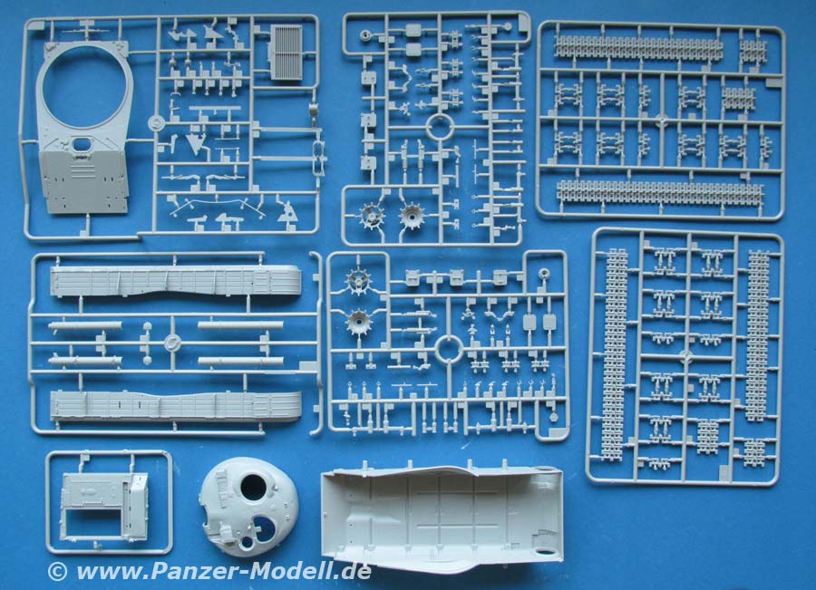Dieser Bausatz beinhaltet insgesamt 22 Spritzlinge plus Klarsichtteile, 3 Platinen PE Teile, Turmoberteil, Unterwanne und ein Decalbogen.