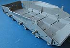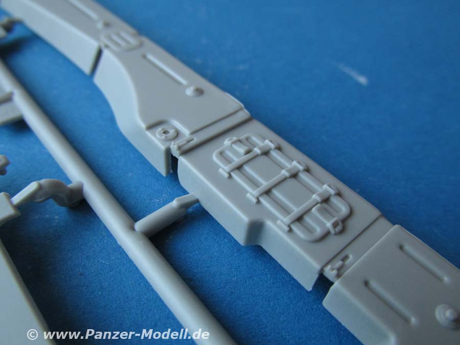 Die beiden Kettenbleche machen einen exzellenten Eindruck mit all den Versteifungsrippen und Details. Obenauf werden die obligatorischen Staukisten in einem Stück geklebt.