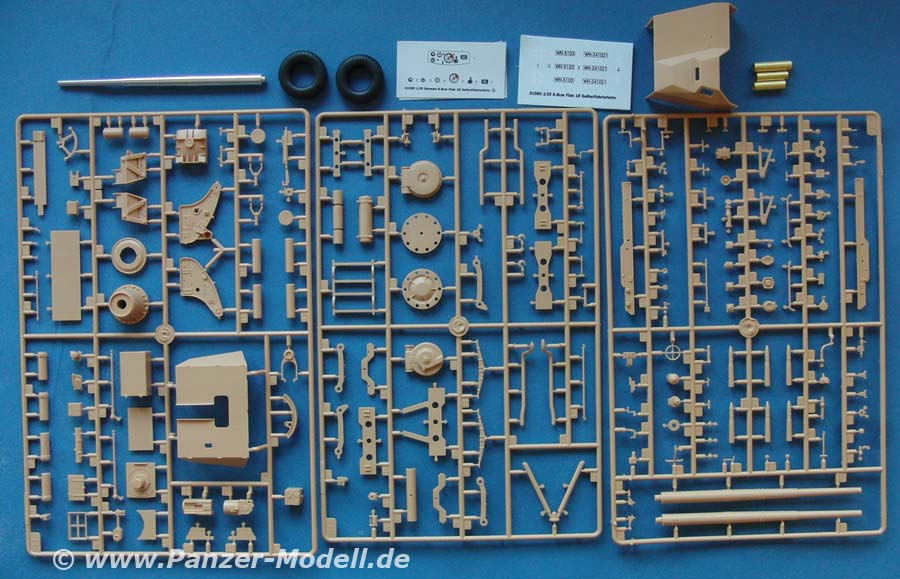 Auf dem Sockel wird dann die 8,8cm Flak aufgebaut. Diese ist mit recht vielen Teilen detailliert. Zudem hat man die Wahl zwischen einem schönen Alurohr und einem längsgeteilten Plastikrohr. Letzteres wird vorn mit Feldern und Zügen als PE Teil versehen.