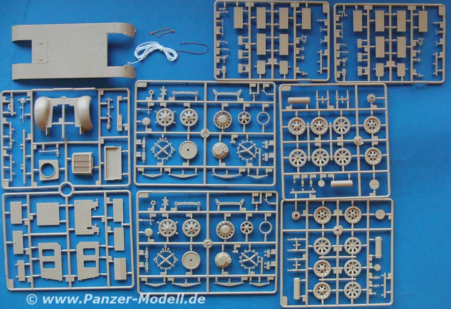 Was mit am erfreulichsten ist, ist dass Trumpeter nach dem gepanzerten Sd.Kfz.8, das auf dem DB10 Fahrgestell mit Schwingarmen basierte, für dieses Modell das korrekte DB9 Fahrgestell mit den Blattfedern beigelegt hat.
