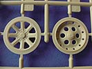 Der Fahrwerksrahmen besteht aus den zwei Längsholmen mit massenhaft Anbauteilen, wie Getriebe, Drucklufttanks, Winde, usw. Die Treibräder wie auch Laufrollen sind ebenfalls sehr fein und sauber gemacht. Die Frontreifen sind aus elastischem Vinyl denen die Felge aus Spritzguss eingesetzt wird. Diese Vinylreifen machen einen sehr guten Eindruck. Diesen fehlt zwar der Seitenaufdruck, dafür ist das Profil sehr fein und wirklich gut gemacht.