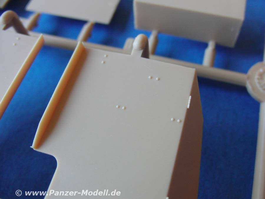 Der gepanzerte Aufbau für den Fahrer ist in einem Stück gemacht und spart somit eine Menge Sorgen beim zusammenbau. Der überpanzerte Motorraum macht ebenfalls einen guten Eindruck. Zwar sind die seitlichen Luken einzeln einklebbar und damit theoretisch offen darstellbar, aber es fehlt an den Innendetails der Luken.