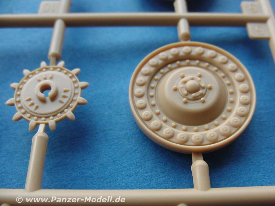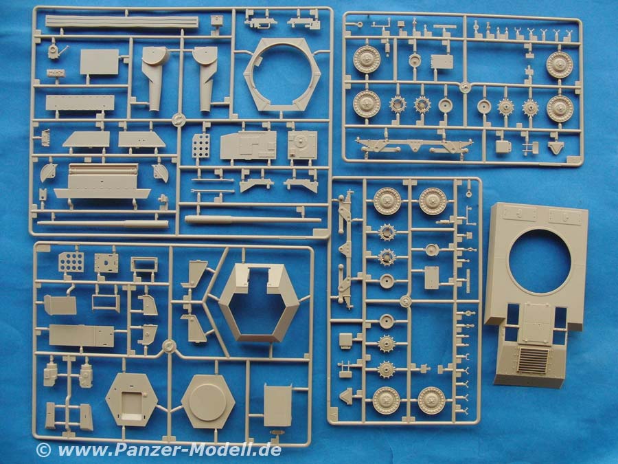 Unter-, Oberwanne und Turm sind als recht große Teile gespritzt und machen einen hervorragenden Eindruck. Das Laufwerk ist recht einzigartig mit seinen Federlementen, die hier als ein Stück pro Seite an die Wanne geklebt werden können. Die Laufrollen sind sehr markant in ihrem Aussehen mit den großen Bolzen - dies ist hier sehr schön wiedergegeben.
