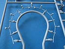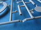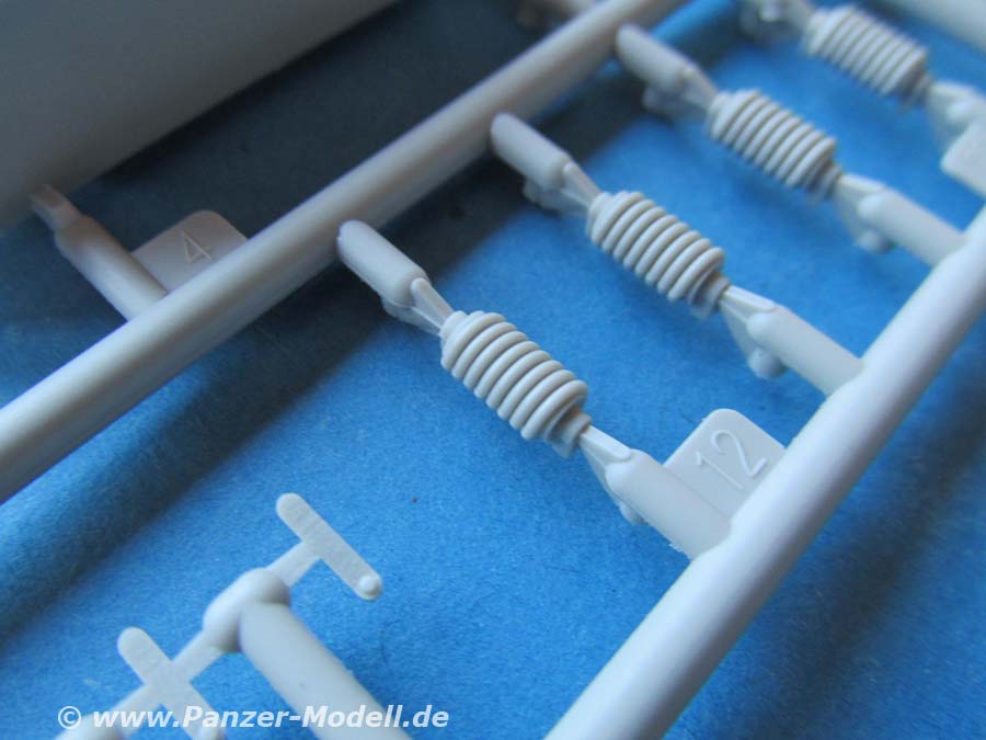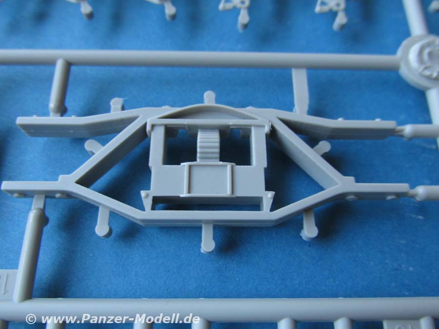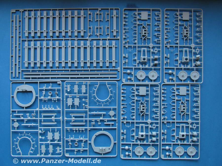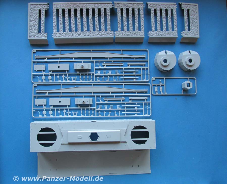 Im Karton finden sich 10 Spritzlinge, zwei Türme, Aufbau und Bodenblech, sowie 5 Schotterbettteile für das Gleis.