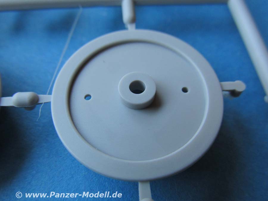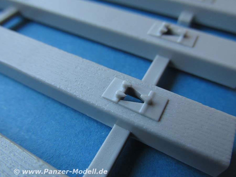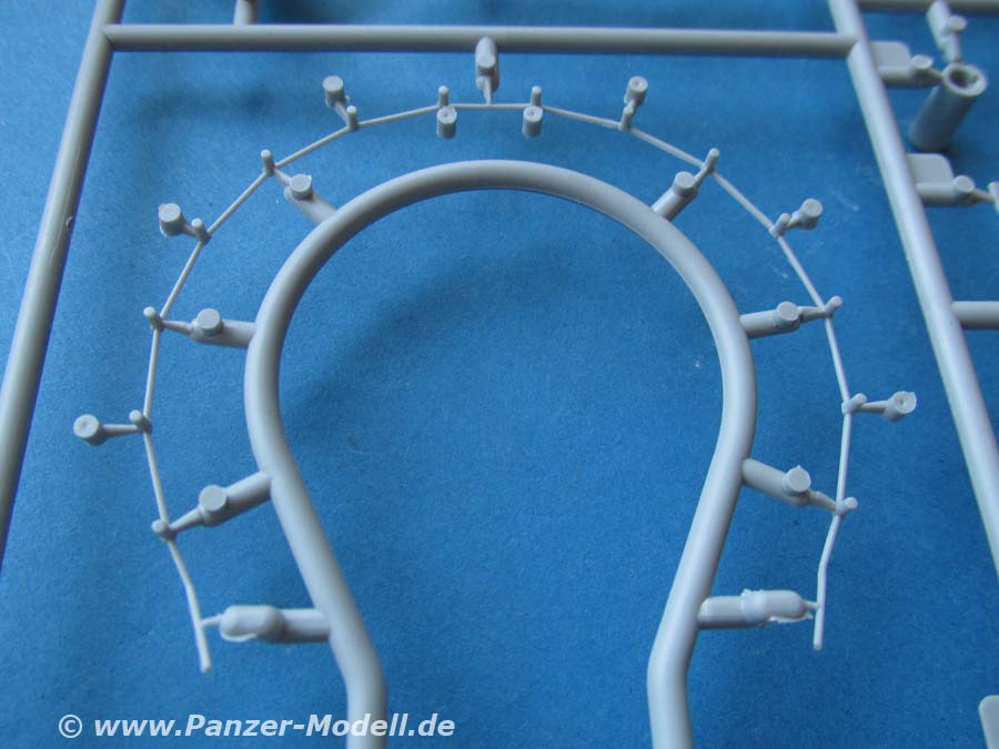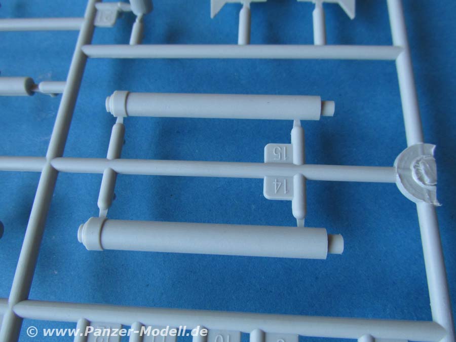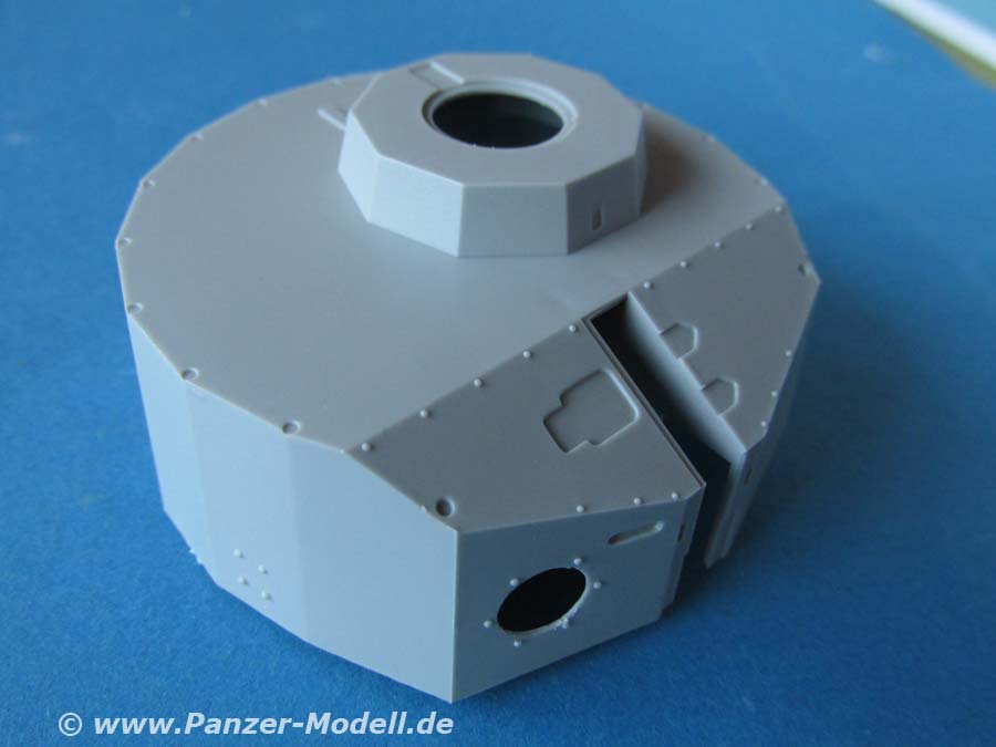 Auch die beiden vieleckigen Geschütztürme machen einen exzellenten Euindruck mit sauberen und verzugsfreien Flächen und Nietendetails. Die Geschützrohre sind aus Plastik und im hinteren Teil zweiteilig, im vorderen Bereich einteilig ausgeführt. diese bleiben in der Höhe beweglich. Die Zugangsluken können offen oder geschlossen gebaut werden, da aber im Inneren keine Details oder Einrichtung vorhanden sind, macht eine offene Darstellung nur Sinn, wenn man sie mit einer Figur füllt.