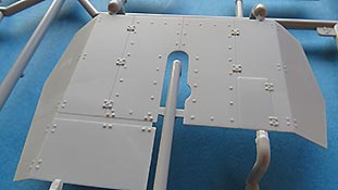 Das Flakschild ist im Prinzip einteilig mit schönen aufgeprägten Nieten und Scharnieren. Von innen wird eine zweite Platte mit Details und Vestrebungen angebracht. An sich schön gemacht, wennauch maßstäblich etwas stark. Leider ist das Design des Schilds nicht zuende durchdacht, denn Trumpeter hat die Sichtluke der Richtoptik geschlossen mit an das Schild angespritzt - eine Darstellung in Feuerstellung ist so nur möglich wenn der Modellbauer die Luke selber vorsichtig heraustrennt.