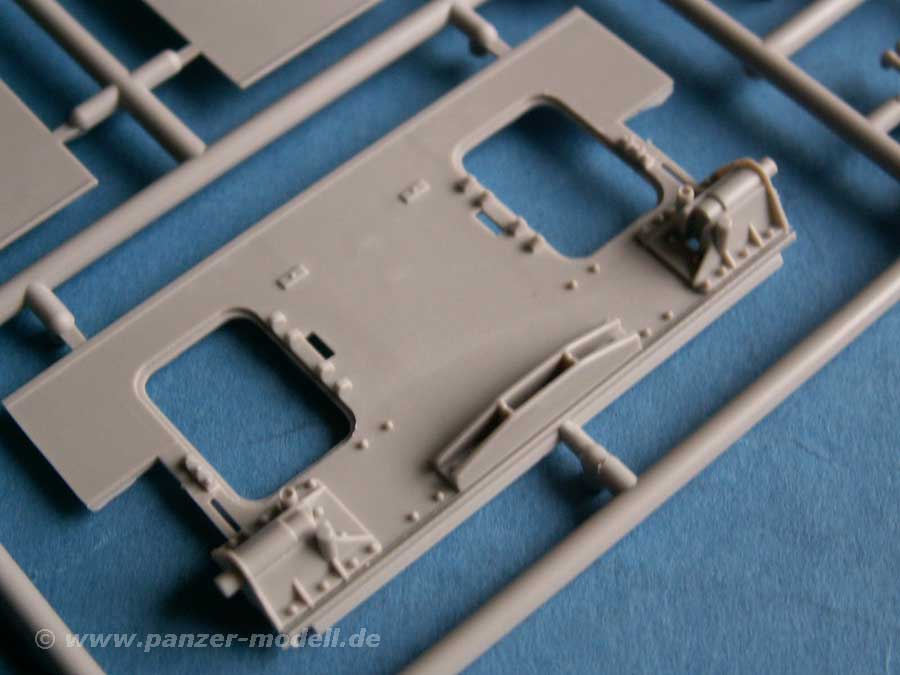 Die Unterwanne ist eine Standard Panzer IV Wanne mit neuer Heckwand und neuen Treibrädern. Das Laufwerk kennt man nun schon vom Munitionspanzer IV, welches beweglcih gebaut werden kann, dafür allerdings keine Herstellerbezeichnung auf den Rollengummis und wesentlich zu kleine Bolzen an der Befestigung an der Wanne aufweist. Die Wanne weist unterhalb die falschen Details auf, aber unter gewöhnlichen Umständen wird das niemand am fertigen Modell sehen.