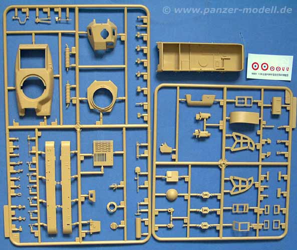 Der ganze Bausatz besteht aus der Wanne, 3 Spritzlingen und den Ketten die je aus einem Stück aus Vinyl sind. Die Qualität ist als gut zu bezeichnen. Auch die Kette macht einen guten Eindruck, auch wenn sie mir ein wenig steif erscheint. Die Wanne ist mit Inneneinrichtung und aufgeprägten Bodendetails ausgestattet und trägt vorn den auffälligen "Hotchkiss" Schriftzug.