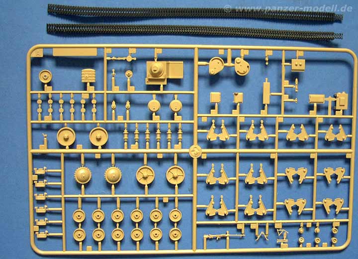 Das Laufwerk sieht sehr gut aus, gut detailiert (jedes Laufrollenpaar besteht aus etwa 8 Teilen inklusive Federung). Die Oberwanne ist schön ausgeformt und auch der Turm weiss zu gefallen. Natürlich ist auch der Grabenüberschreitsporn am Heck im Lieferumfang enthalten. Das Werkzeug ist von der üblichen Qualität.