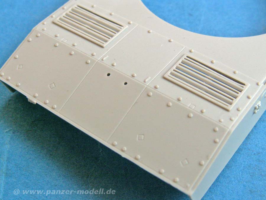 Und auch die Inneneinrichtung der Wanne und des offenen Turms an sich sind sehr gefällig mit netten Details. Das Rohr der 10,5cm leFH ist aus zwei Plastikhalbteilen wie auch die Mündungsbremse zu bauen.