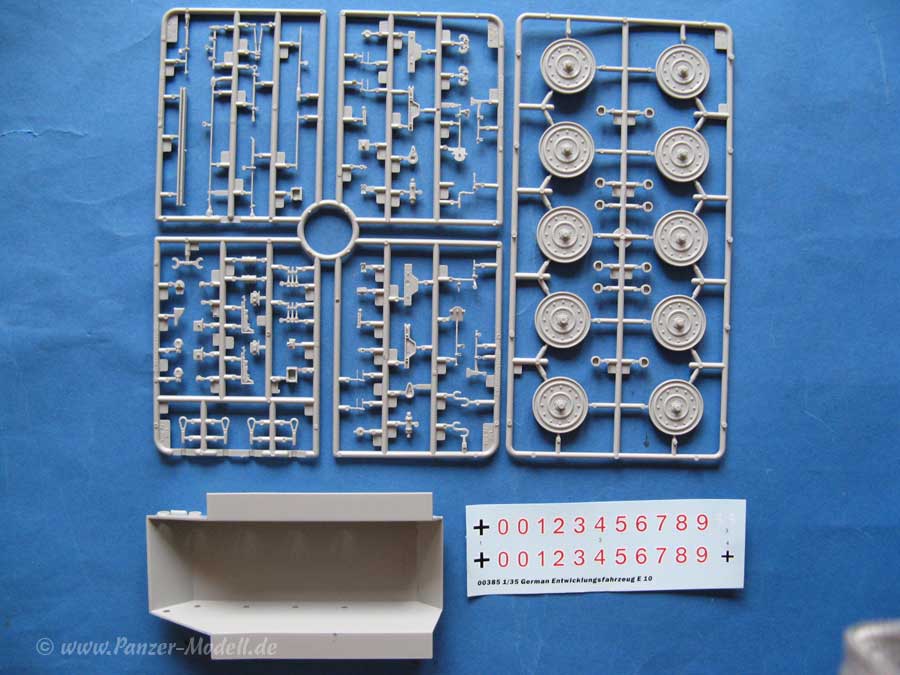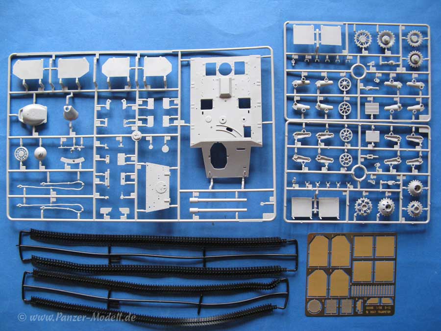 Im Karton finden sich 517 Teile an 16 Spritzlingen, der Unterwanne, zwei Sätzen Gummiketten, einer Platine mit PE Teilen und einen Decalbogen.