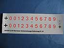 Als Markierungs/Bemalungsvorschlag liegt ein doppelseitig farbig gedruckter DIN A4 Bogen bei und der Decalbogen bietet Ziffern in rot/weiß von 0-9, sowie Balkenkreuze. Allerdings zeigen die Bemalungsvorschläge wede die Ziffern, noch sonstiger Markierungen, sondern nur verschiedene Möglichkeiten des Dreifarbtarnmusters.