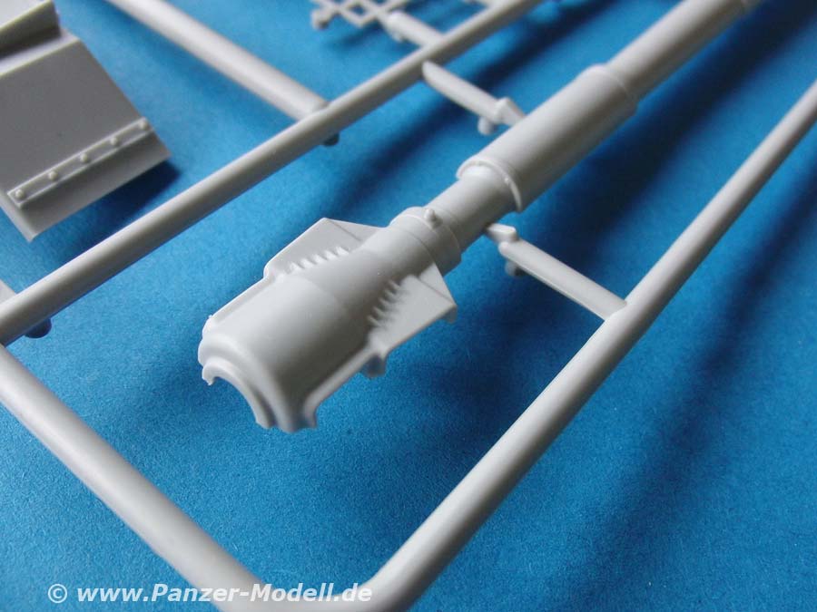 Das Kanonenrohr ist aus Plastik und wieder in zwei Halbteilen dargestellt - dies mag in der etwas verschachtelten Mündungsbremse begründet liegen - wobei es sinniger gewesen wäre das Rohr einteilig und nur die Mündungsbremse zweigeteilt zu machen.