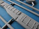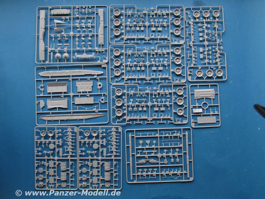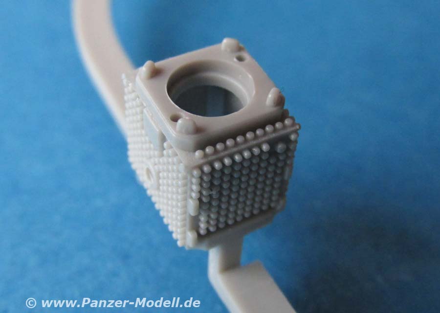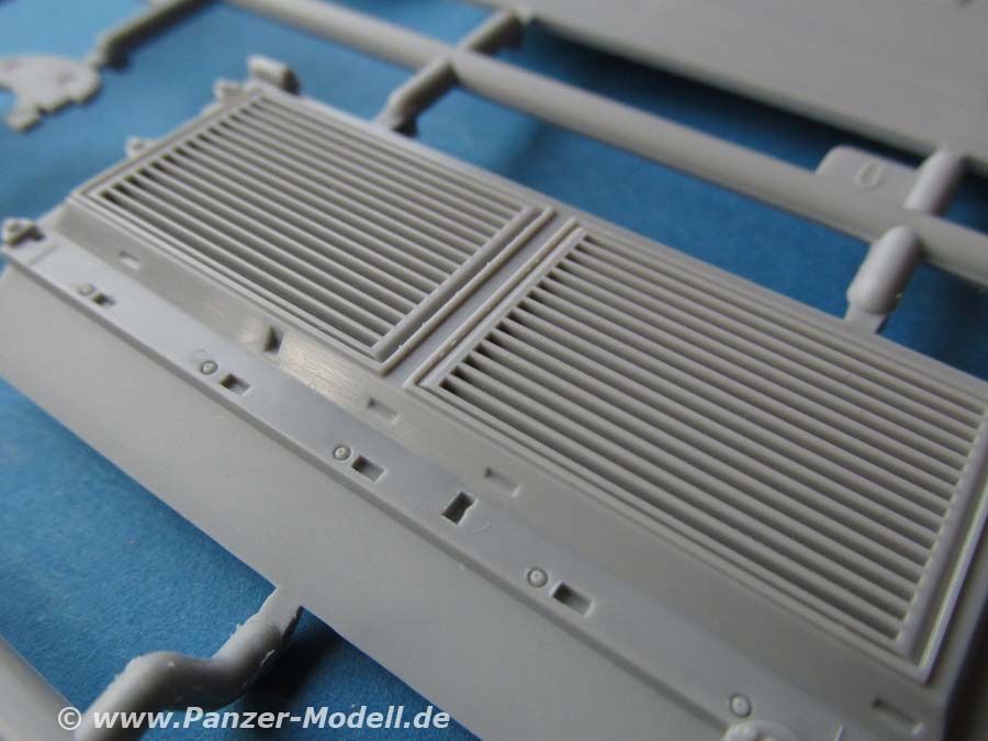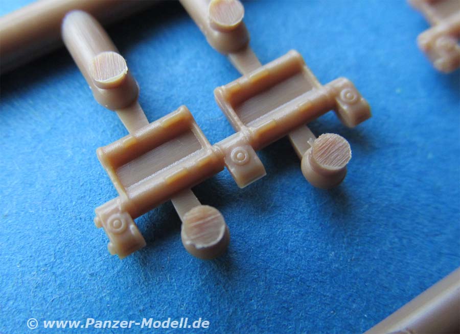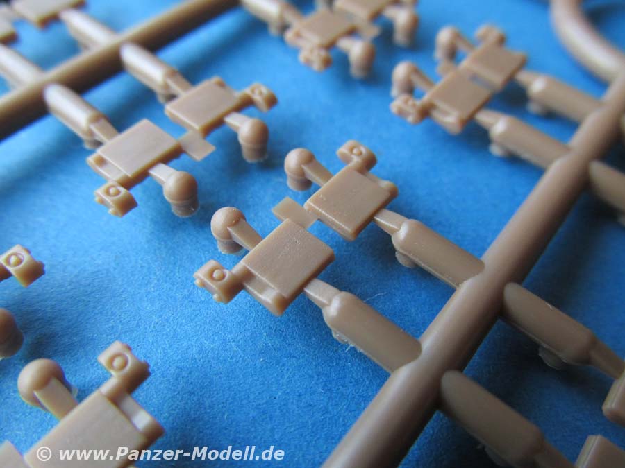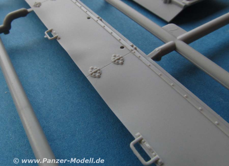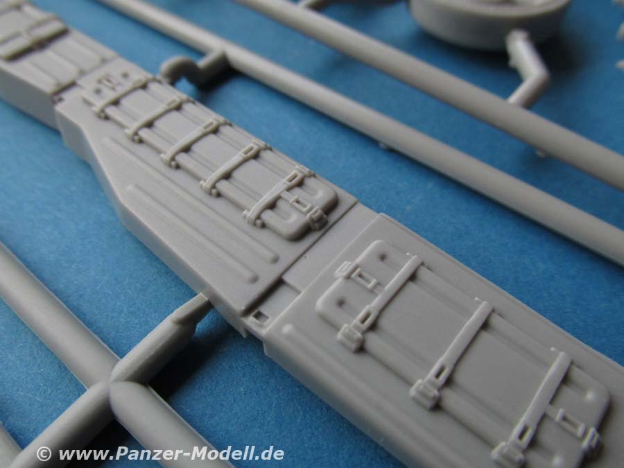 Auch an den Kettenblechen und Seitenschürzen hört die Freude nicht auf. Auch hier sauberer Guss und klare, saubere Details. Sogar die bereits angegossenen Halterungen, Staukisten, Nietenköpfe und Anbauteile sind ganz ausgezeichnet dargestellt. Dünne halterungen werden zusätzlich als Ätzteile angeboten und müssen vom Modellbauer aufgebracht werden. Bei den Seitenschürzen wurde sogar an eine leicht wellige Form gedacht um die im original aus Gummi gemachten Schürzenteile realistisch darzustellen.