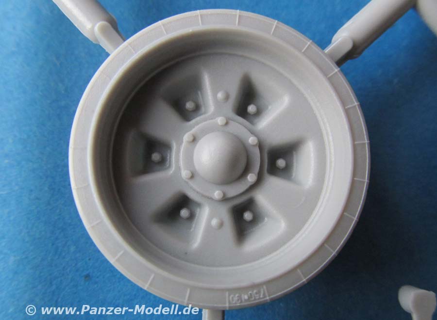 Auch die Laufrollen lassen das Herz höher schlagen, denn die Darstellung der Felge und dteails ist ganz hervorragend, denn auch so feine markierungen wie auf der Seite der Gummibandagen sind dargestellt. Zwar irrtieren die segmentierenden Nähte auf den Gummierungen, denn diese kann man auf Vorbildfotos nicht erkennen, aber die Feinheit lässt darauf schließen, dass sie am Original auch nur bei naher Betrachtung und bei neuen Laufrollen sichtbar wären.