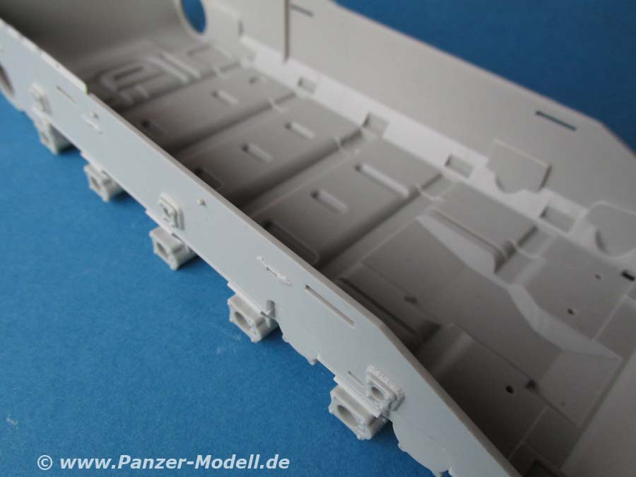 In die Oberwanne müssen für diese Version einige Löcher gebohrt werden, die von der Innenseite an den korrekten Stellen schon angedeutet sind. Auf die Oberwanne werden dann die Zusatzpanzerplatten entsprechend angebracht. Diese sehen sehr gut und fein detailliert aus.