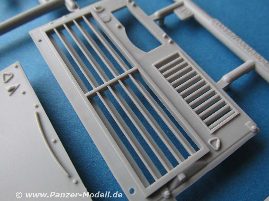 Die Oberwanne ist vielmehr nur ein Deckblech für den vorderen Teil mit Turmring. Das Motordeck setzt aus zwei teilen mit durchbrochenen Rippen und PE Gittern. Es gibt zwar keinen Motorraum im Inneren aber das Motordeck ist auch so ein absoluter Hinkucker. Dazu gibt es die einzeln anzubringenden Kettenbleche und Zusatztanks und Staukisten.