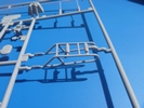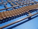 An der Front werden 2 große Lagerböcke angebracht, auf denen ein großer Teil der Lafette aufliegt. Die Kettenabdeckungen bekommen große Geländer. Der Lagerbock auf dem Motordeck diente dazu, das Rohr in Fahrstellung zurückzuhalten. Dies lässt sich am Modell wegen der feststehenden Auslegung der Kanone leider nicht darstellen. Dafür lassen sich die beiden Leitern am Heck beweglich bauen, so dass man sie ein- und ausklappen kann. Die Leitersprossen bestehen aus flachen Ätzteilwinkeln. Laut Bauanleitung sollen die Leitern waagerecht nach hinten raus stehen, was nicht unbedingt einen Sinn ergibt. Auch werden entgegen der üblichen Art und Weise bei KVs die Abschleppseile am Heck angebracht. Die Seile bestehen aus einem Bindfaden, nicht mehr aus verdrilltem Kupferdraht. Die beiden Schutzschilde an der Front lassen auf beweglich bauen. Man kann sie nach vorn abklappen und mit den Bügeln auf den Ketten abstützen. Die Bauanleitung sieht nur die aufgerichtete Version vor. Manche Originalfotos zeigen eine große Kiste auf der rechten Kettenabdeckung direkt hinter dem Schutzschild, manche nicht. Trumpeters Version ohne diese Kiste ist zumindest nicht undenkbar.
