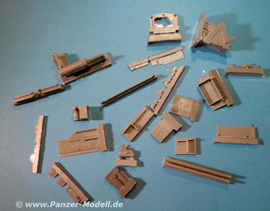 Im Bausatz enthalten sind 80 Bauteile aus Resin, die sehr sauber und schön detailliert gegossen sind und die Fenster aus klarer Plastikkarte und schon vorgestanzt.