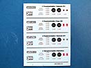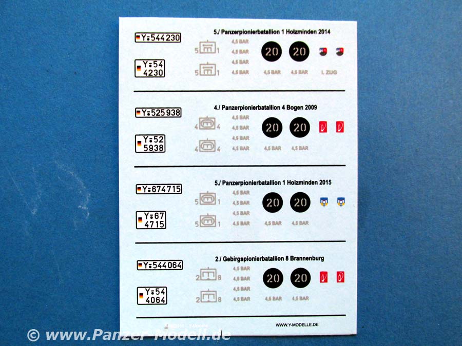 Mehrseitenansichten eines fertigen Modells am Ende der Bauanleitung zeigen den Kipper und die Tarnbemalung. Dazu die Positionen der Nummernschildern und taktischen Zeichen. Der Decalbogen bietet taktische Zeichen, Nummernschilder, MLC Schilder, Einheitenembleme und Raddruckangaben. Die möglichen Makrierungen der Einheiten: