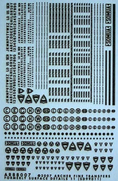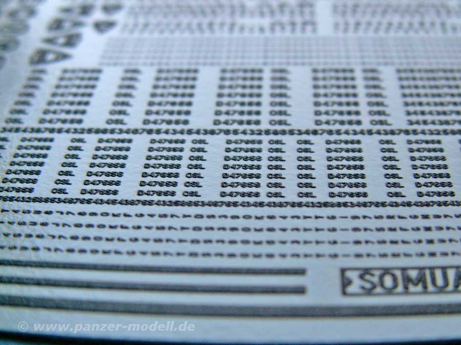 Dieses Set enthält eine große Auswahl an Buchstaben, Zahlen, Firmenlogos und Markierungen die man sonst als erhabene, aufgeschweißte Details am Fahrzeug hat. Die Möglichkeiten zur Verfeinerung des Modells mit diesen erhabenen Zahlen und Buchstaben (z.B. für Gusstürme) sind hiermit gut zu realisieren und auch für vergessene Firmenlogos, wie z.B. das "SOMUA" Zeichen sind hiermit ganz einfach nachzutragen.