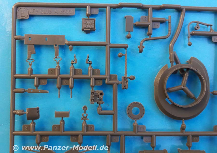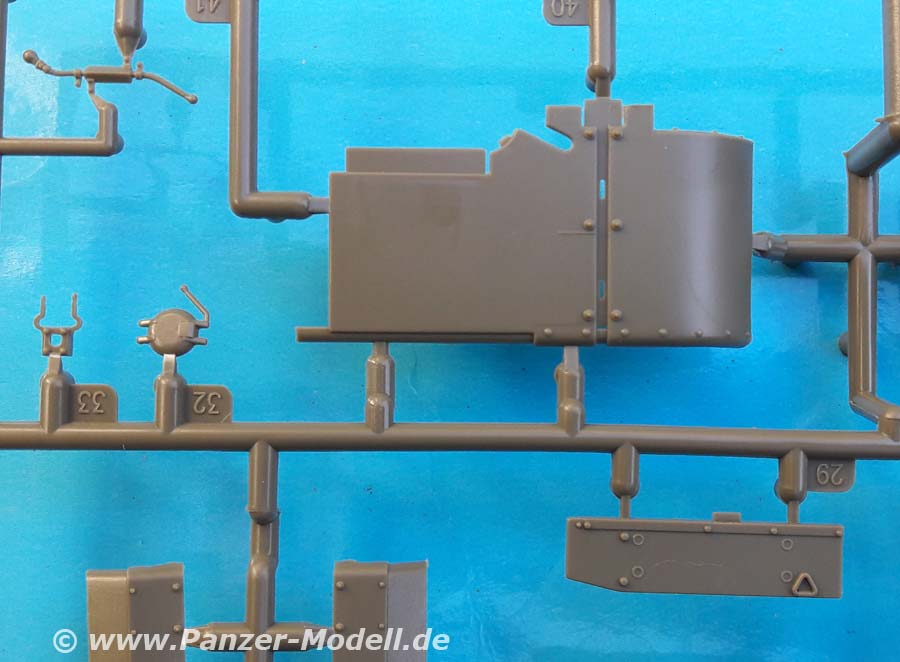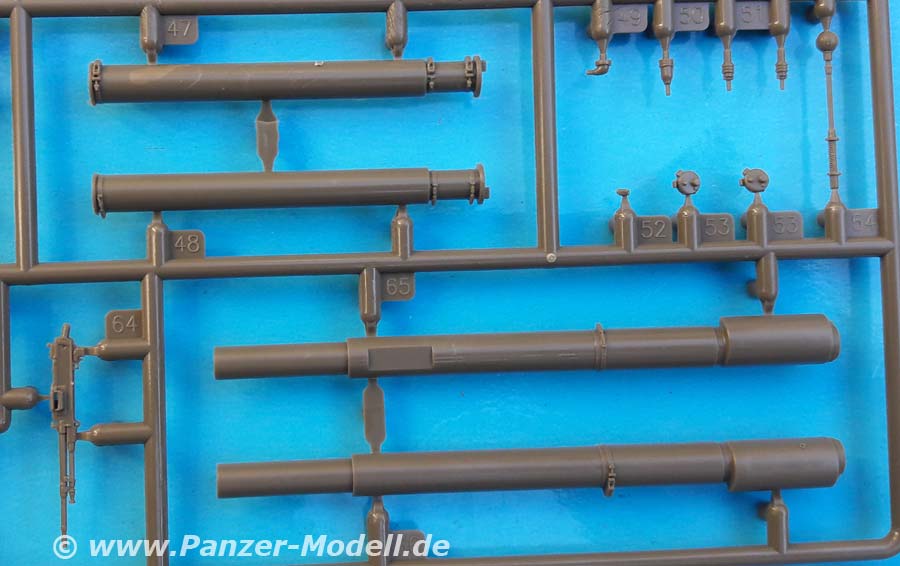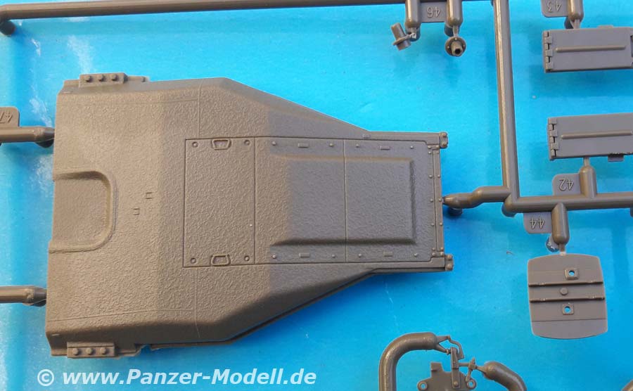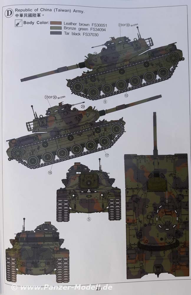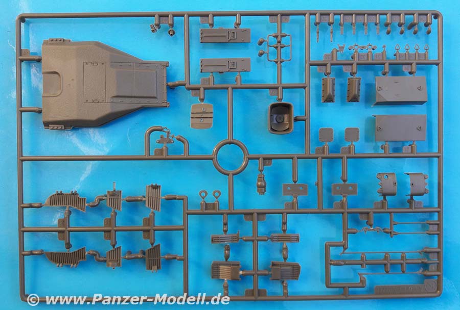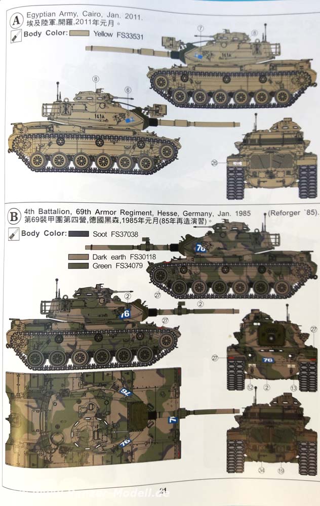 Wie auch schon beim M60A1 und M60A2 machen die Bauteile wieder einen ganz hervorragenden Eindruck. Allein die Unterwanne aus einem Guss, weist schon unheimlich viele scharfe Details und Hinterschneidungen auf. Die Detailvielfalt setzt sich am gesamten Bausatz fort. So sind zum Beispiel sämtliche Griffe separat vorhanden oder sauber Graviert, da wo andere Hersteller es auch gerne einmal bei angegossenen „Klumpen“ belassen. Auch ist eine feine Gussstruktur auf Turm und Wanne vorhanden allerdings auch wieder auf dem Motordeck, was hier nicht ganz richtig ist. Der hervorragenden Qualität des Bausatzes tut dieses keinen Abbruch. Es können 2 verschiedene Versionen gebaute werden: der M60A3 oder der M60A3 TTS mit Thermalsichtgerät. Der Modellbauer hat die Wahl zwischen Stahl- und Aluminiumlaufrollen, die Torsionsstäbe des Fahrwerkes sind vorhanden, der Fahrerplatz hat eine teilweise Inneneinrichtung, sämtliche Optiken bestehen aus klarem Plastik, die Sekundärbewaffnung ist bereits aufgebohrt, etc. Fischhäute sind minimalst vorhanden, aber fallen kaum ins Gewicht. Auswerfer-Marken sind geschickt an Stellen gesetzt, welche man später nicht mehr sieht. Die beiliegenden T142 Ketten machen einen sehr guten Eindruck, können aber bei Bedarf mit Ketten aus dem Aftermarket Bereich ersetzt werden. Es sind 5 Decal-Optionen vorhanden: 1. Ägyptische Armee, Kairo, Januar 2011 in Sandfarben Außerdem bietet hier der Aftermarket Bereich und die richtigen Referenzen unheimlich viele Möglichkeiten für den „Wunsch“ M60A3 Fazit: wieder einmal bin ich begeistert von der gebotenen Qualität. Aufgrund der Teileanzahl und des etwas komplizierteren Aufbaus ist der Bausatz wohl eher nicht für den absoluten Anfänger geeignet, aber jeder erfahrene Modellbauer wird wohl seine wahre Freude haben.