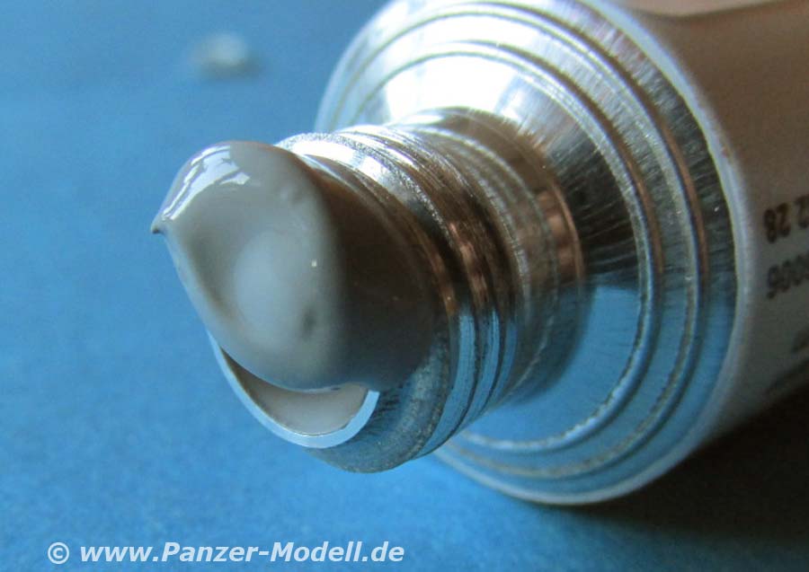 In der Tube sind 20ml, entsprechend 39 Gramm, graue Spachtelmasse, die sich leicht aus der Tube drücken lassen. Die Dosierung direkt von der Tube aufs Modell geht nur bei größeren Flächen aufgrund der recht großen Öffnung. Großer Vorteil als Acrylspachtelmasse - es gibt keinen penetranten Gestank, wie man ihn z.B. vom Tamiya Putty kennt. Ausserdem kann man Werkzeug, Finger und am Modell überflüssigen Spachtel ganz einfach mit Wasser entfernen.